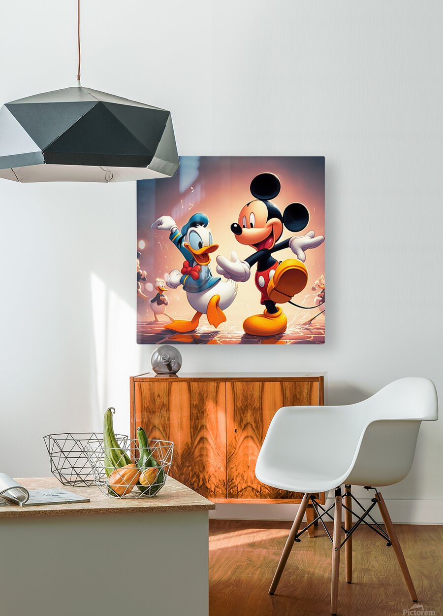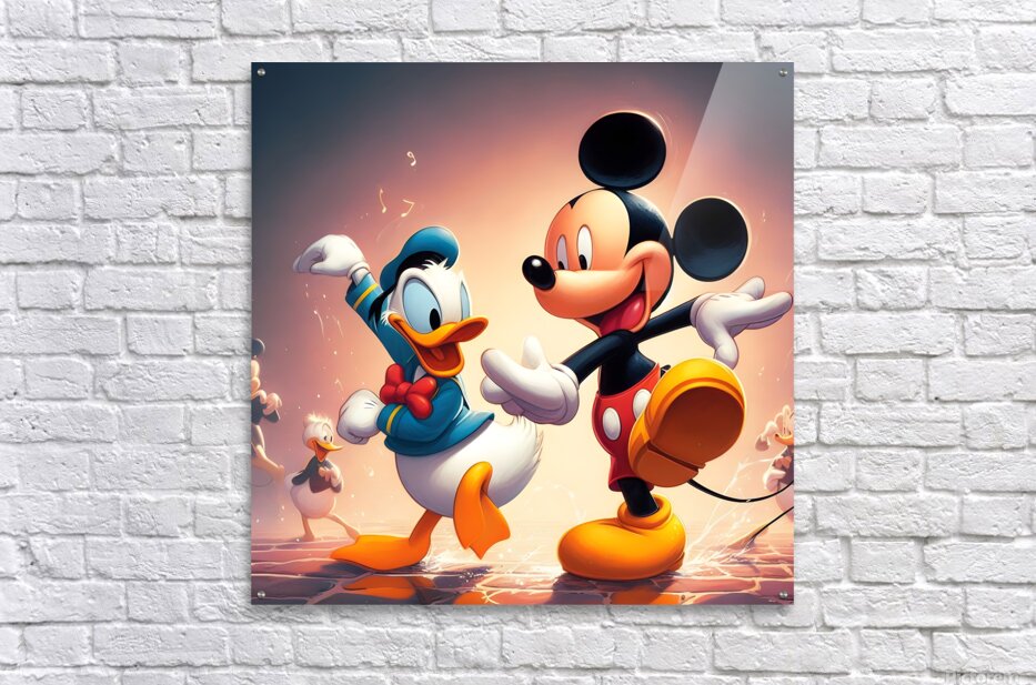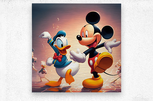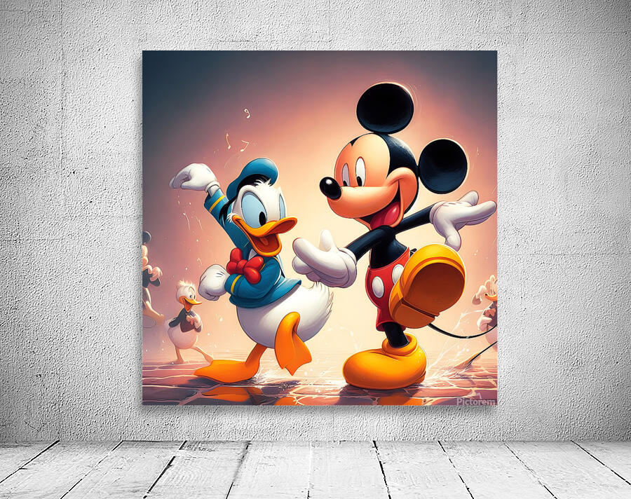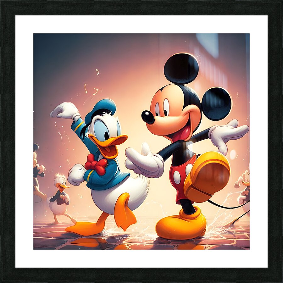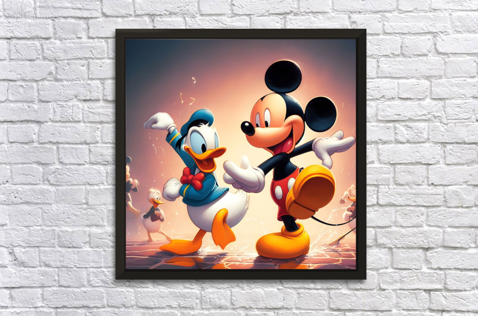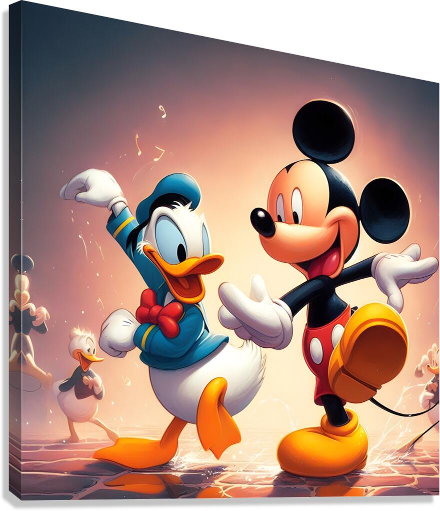 This vibrant and cheerful image captures the timeless charm of Mickey Mouse and Donald Duck in a lively dance scene. The artwork is rendered in a modern, painterly style with a soft, glowing effect, making it a delightful addition to any room. The dynamic poses of Mickey and Donald, along with the whimsical background details, evoke a sense of joy and nostalgia. This piece is perfect for adding a touch of Disney magic to your home decor.