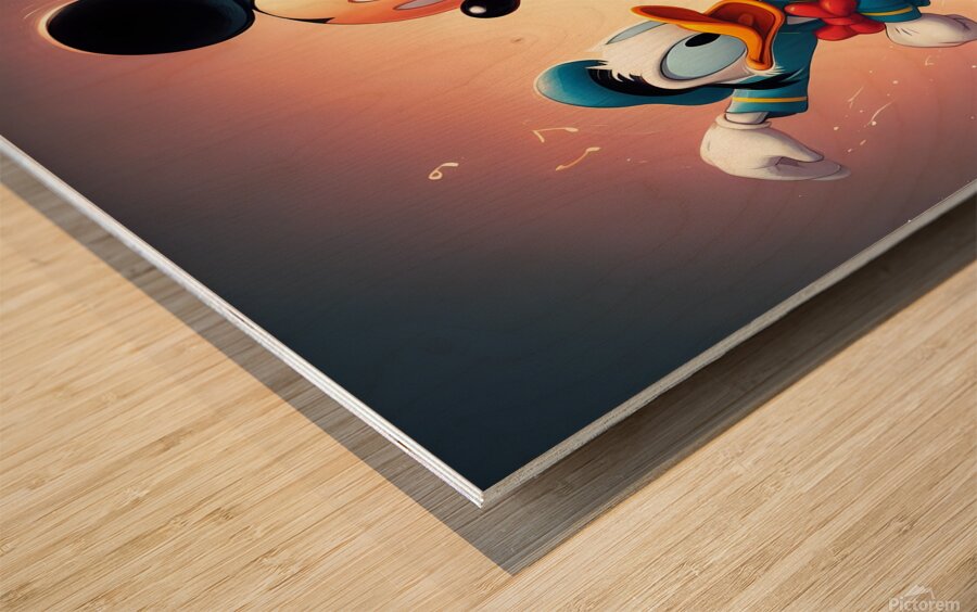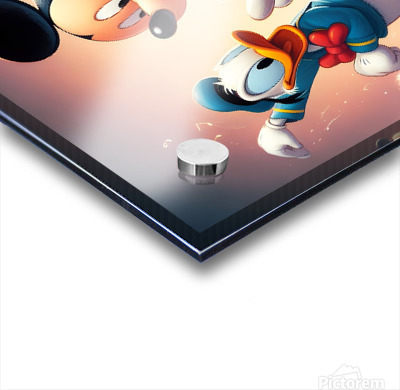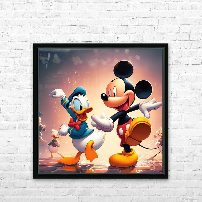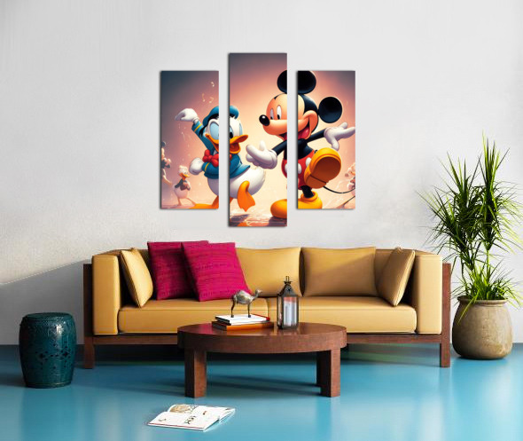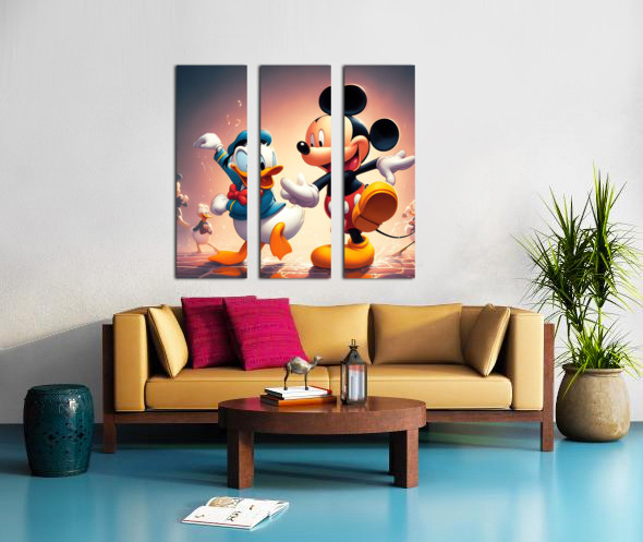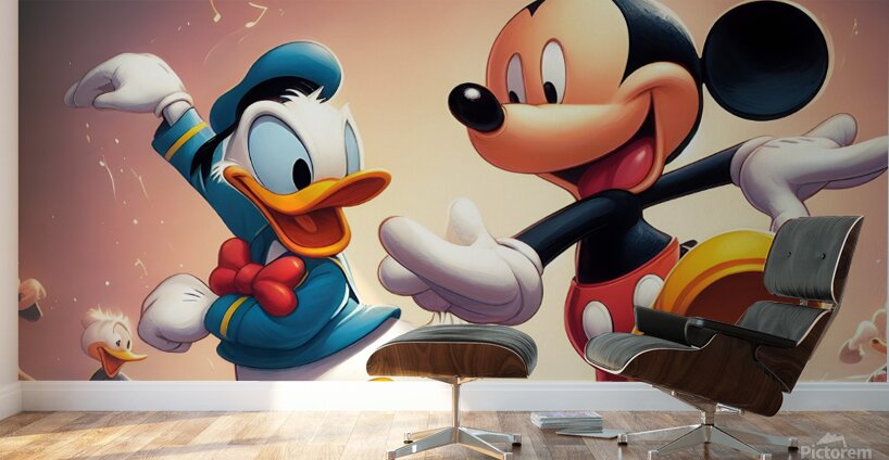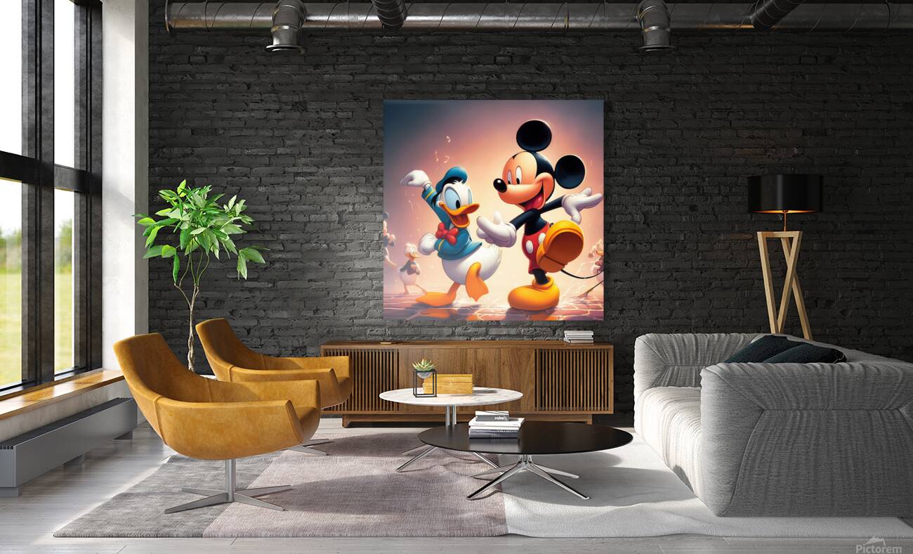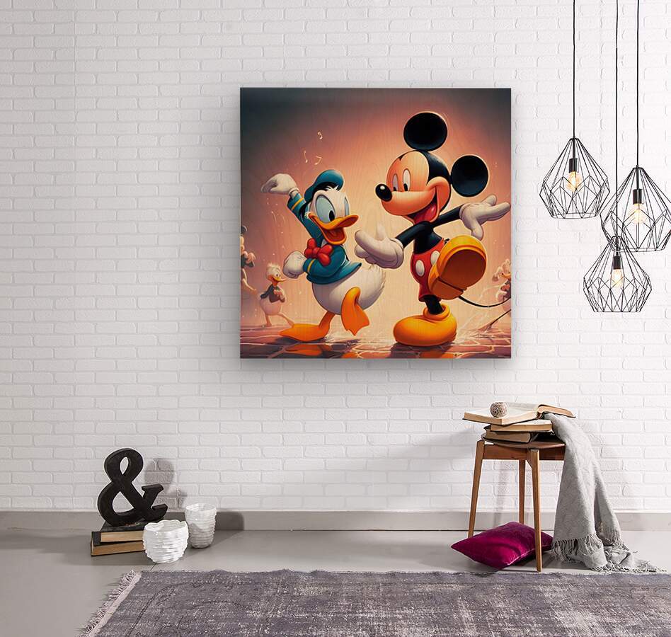 This vibrant and cheerful image captures the timeless charm of Mickey Mouse and Donald Duck in a lively dance scene. The artwork is rendered in a modern, painterly style with a soft, glowing effect, making it a delightful addition to any room. The dynamic poses of Mickey and Donald, along with the whimsical background details, evoke a sense of joy and nostalgia. This piece is perfect for adding a touch of Disney magic to your home decor.