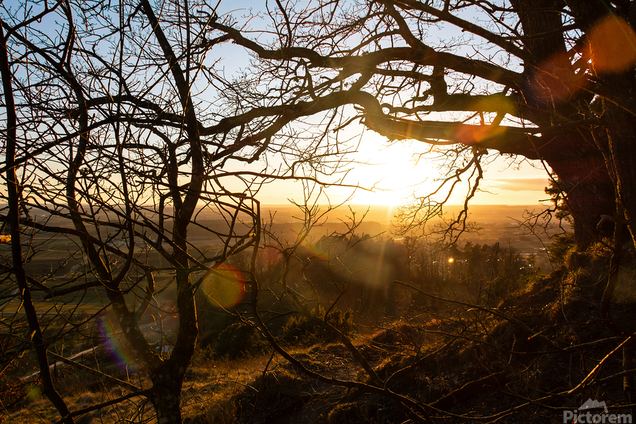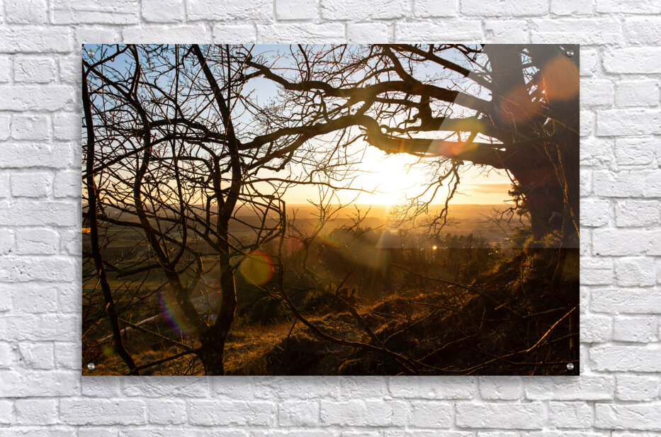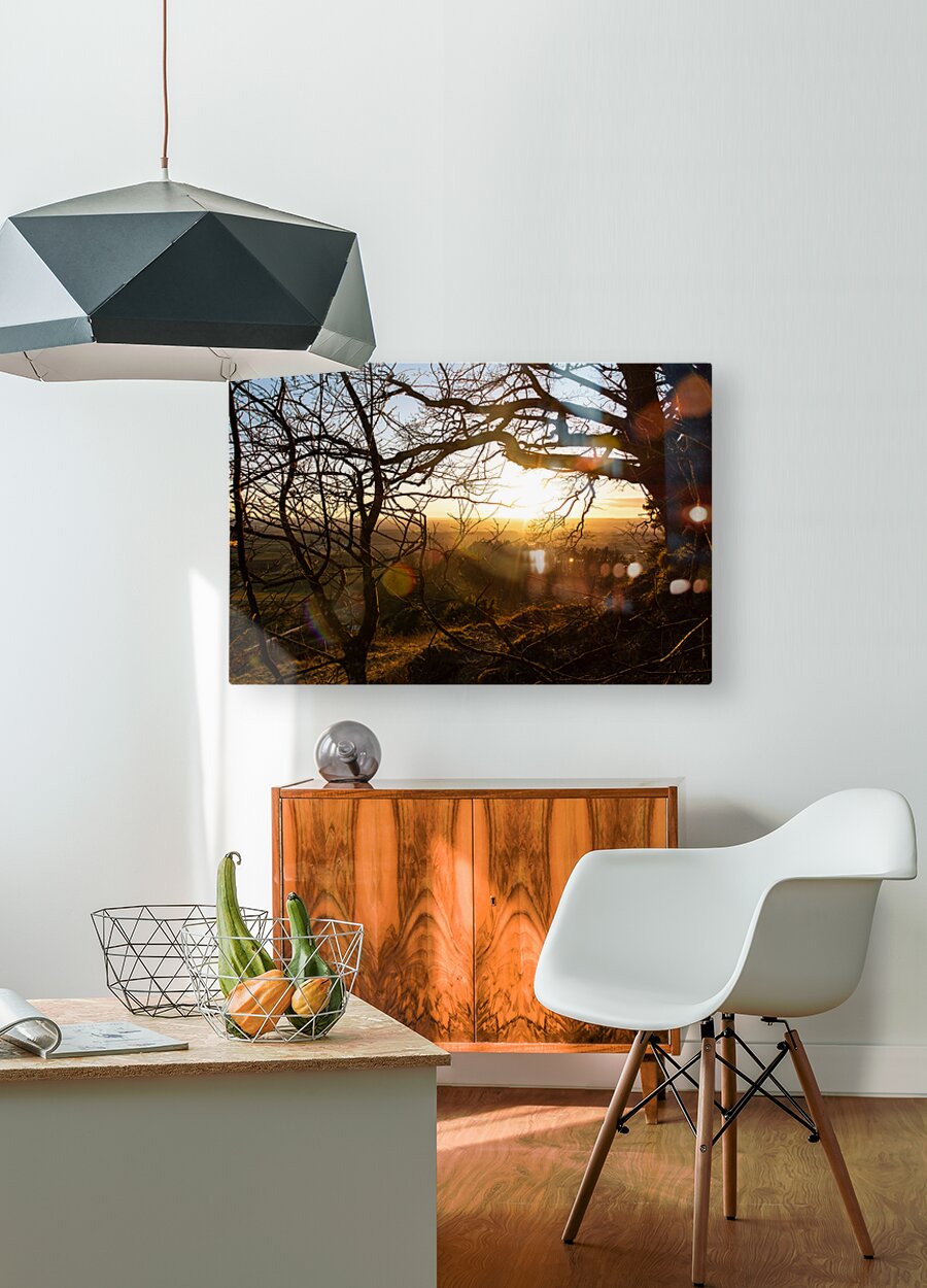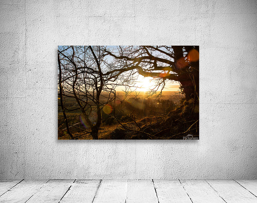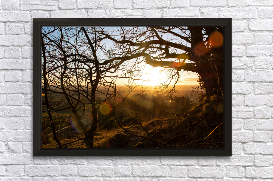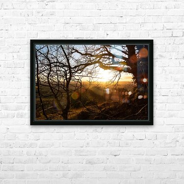 Get this artwork "Setting sun shining through the branches of a beautiful old tree in front of countryside " in a framed print.