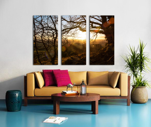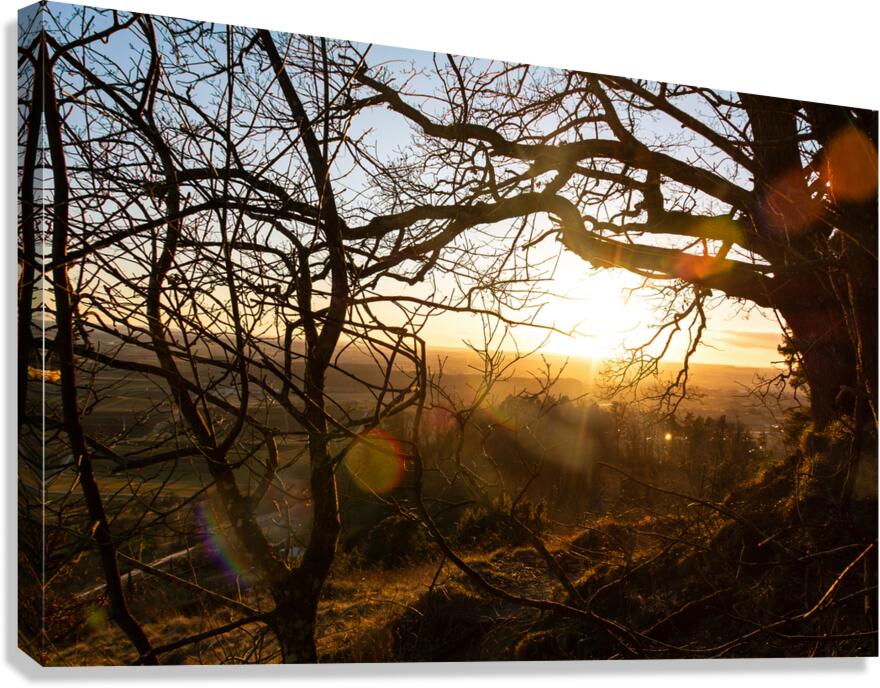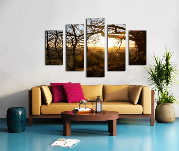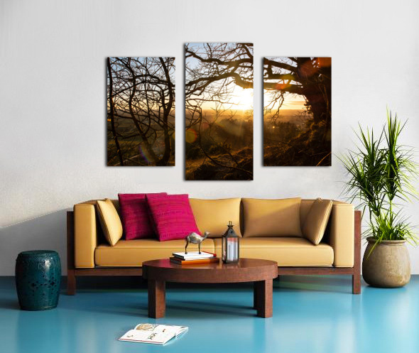 SETTING SUN SHINING THROUGH THE BRANCHES OF A BEAUTIFUL OLD TREE IN FRONT OF COUNTRYSIDE  CALADOART  Canvas Print