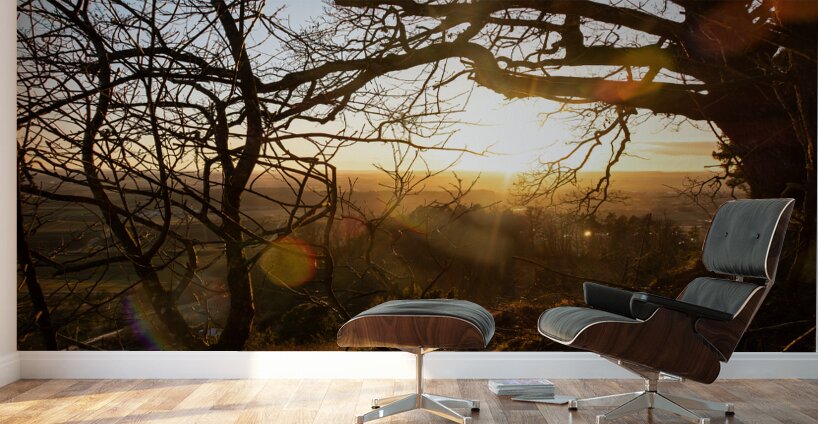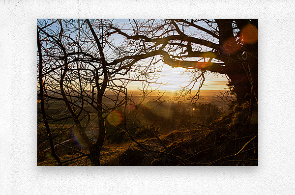 Setting sun shining through the branches of a beautiful old tree in front of countryside  Wall Decor Frame