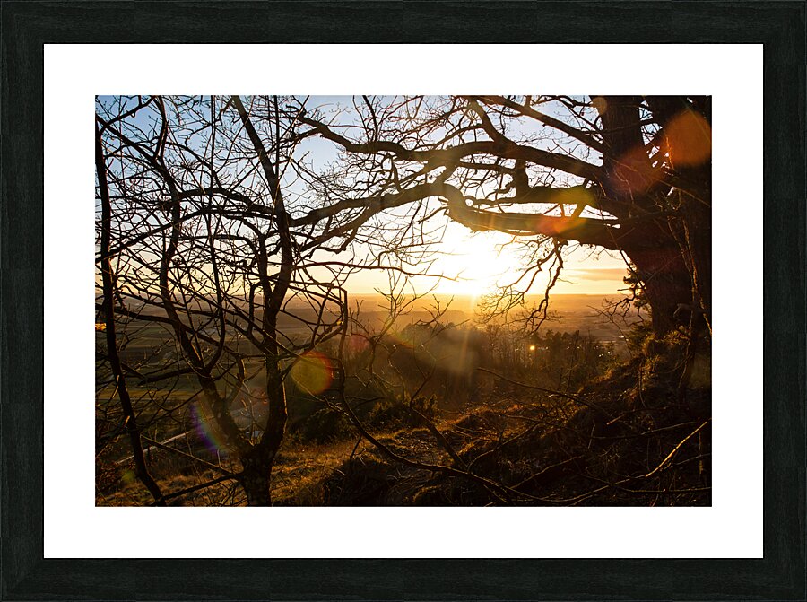 Setting sun shining through the branches of a beautiful old tree in front of countryside  Picture Frame Printing