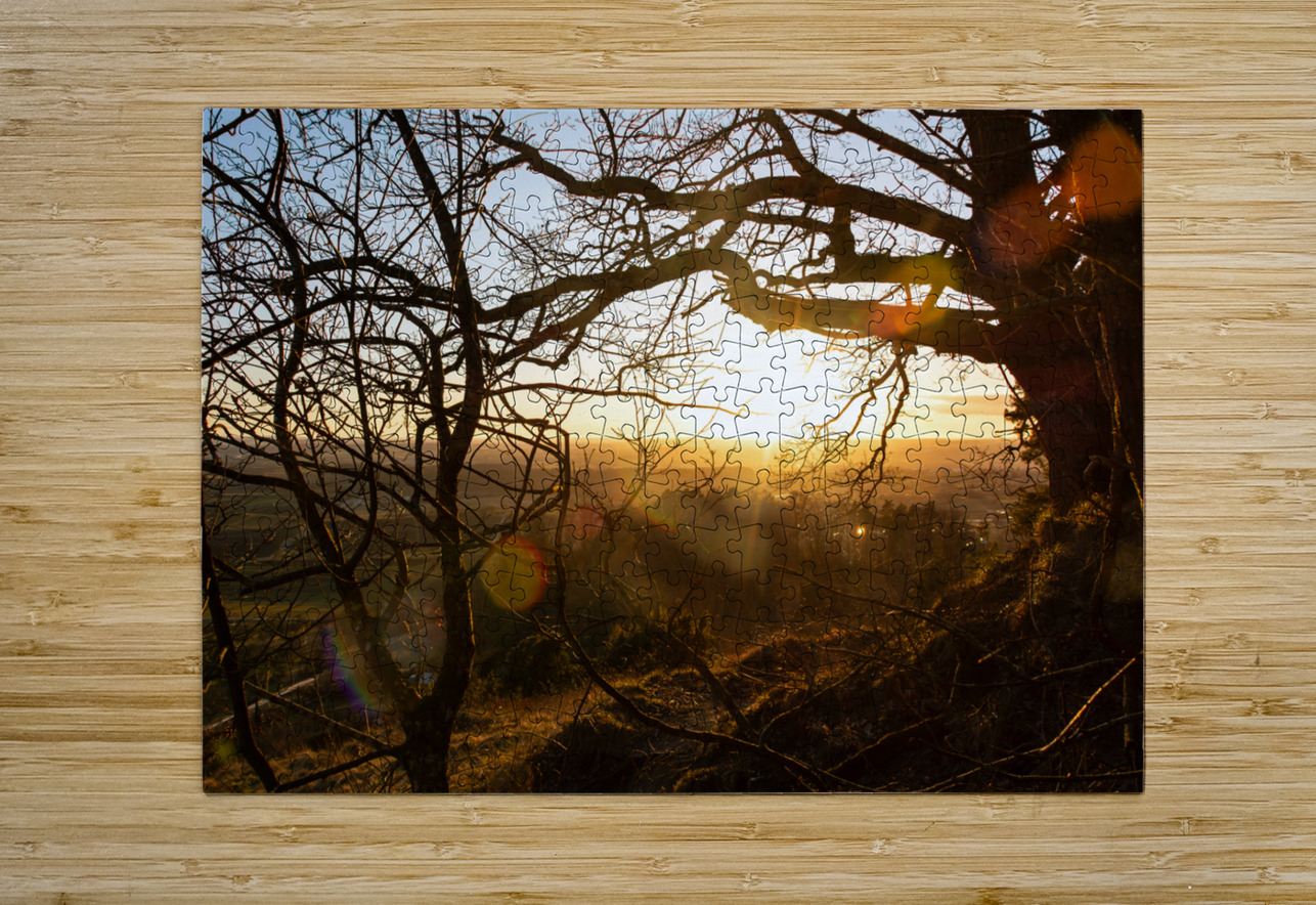 Setting sun shining through the branches of a beautiful old tree in front of countryside  caladoart Puzzle printing