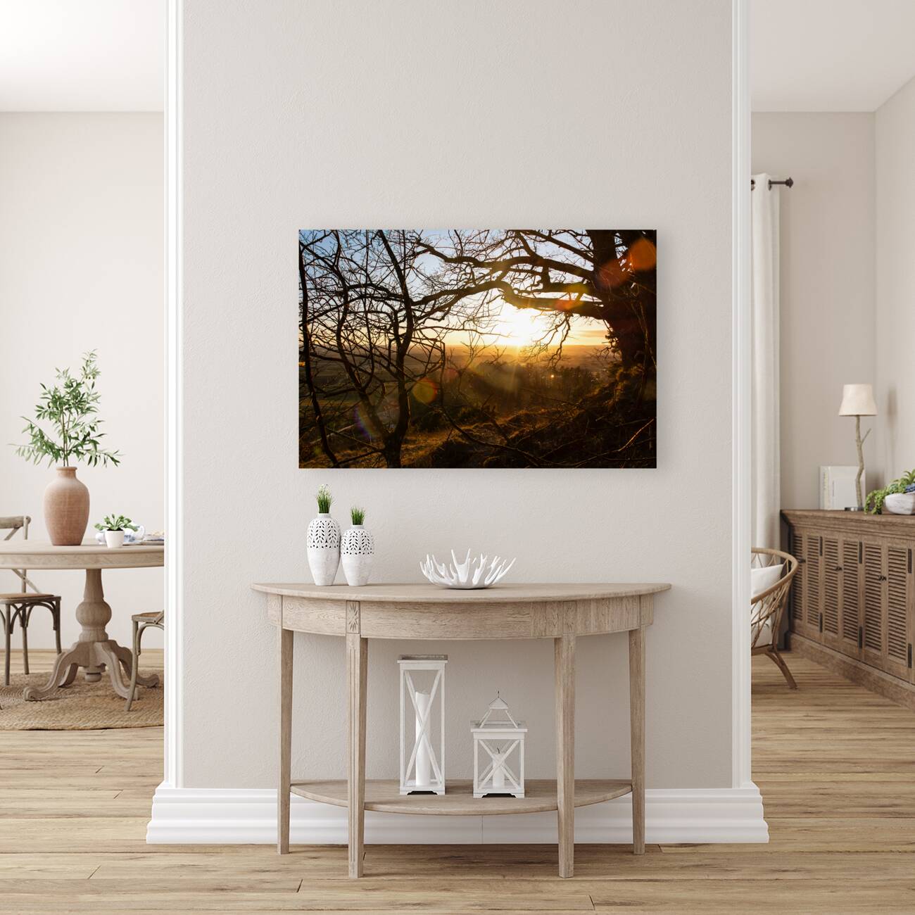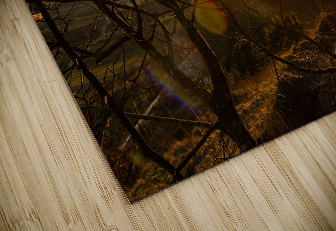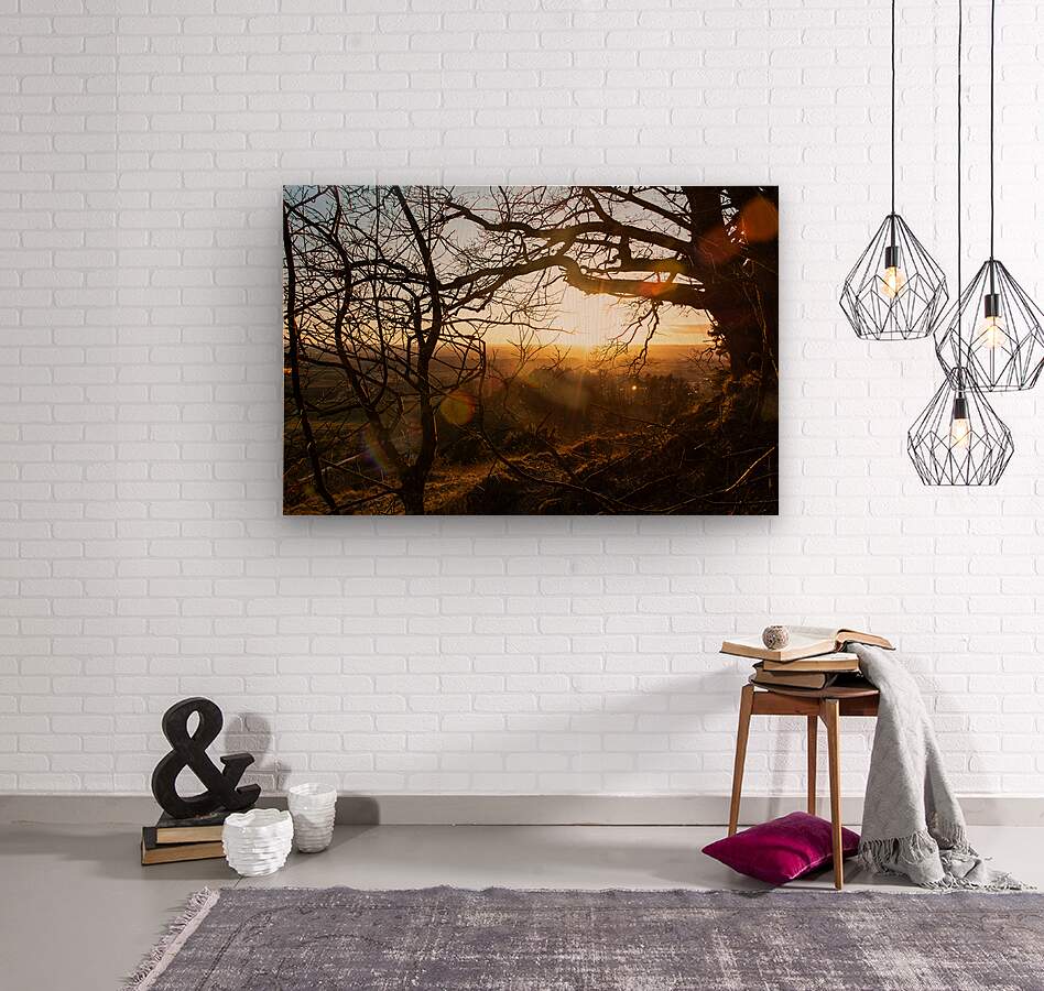 ABOUT THIS ARTWORK: SETTING SUN SHINING THROUGH THE BRANCHES OF A BEAUTIFUL OLD TREE IN FRONT OF COUNTRYSIDE