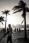 BLACK AND WHITE PHOTO OF PEOPLE STROLLING ALONG THE PROMENADE AT IPANEMA BEACH IN RIO DE JANEIRO