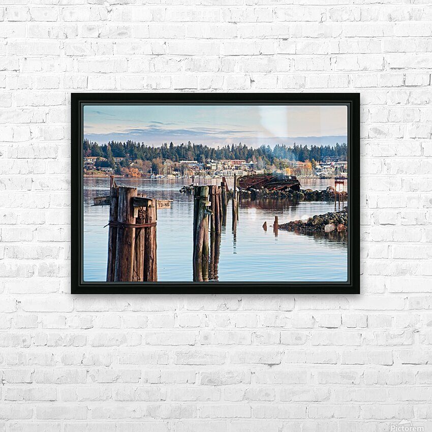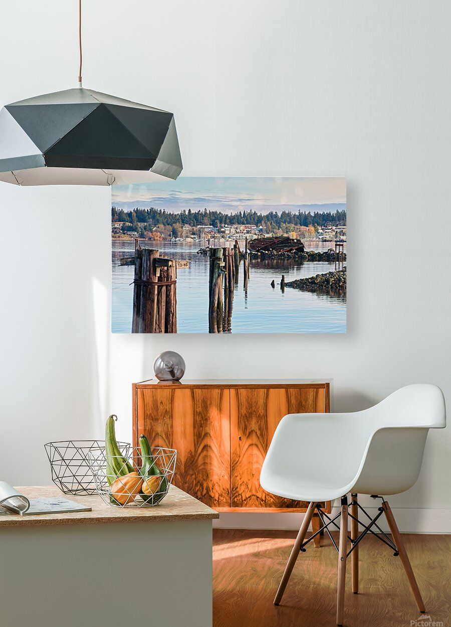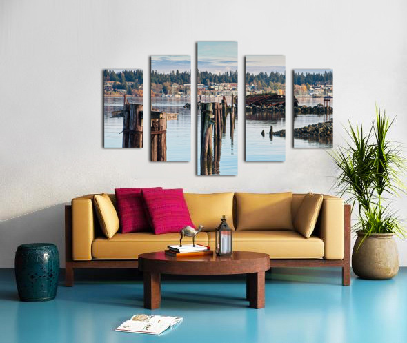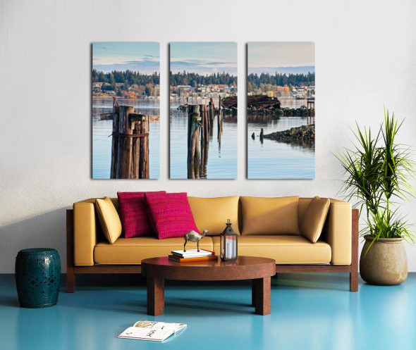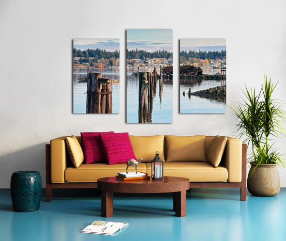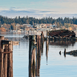 Wooden pilings lead the eye towards a rusted shipwreck partially submerged in a calm body of water. The ships were placed in Royston, BC for erosion control and fish habitat. In the background, a tree-lined shore with houses and buildings is visible under a cloudy sky.