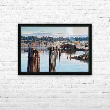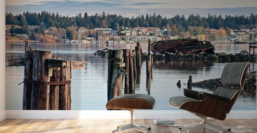 Wooden pilings lead the eye towards a rusted shipwreck partially submerged in a calm body of water. The ships were placed in Royston, BC for erosion c...[+]