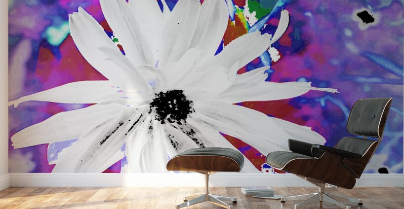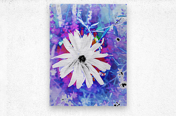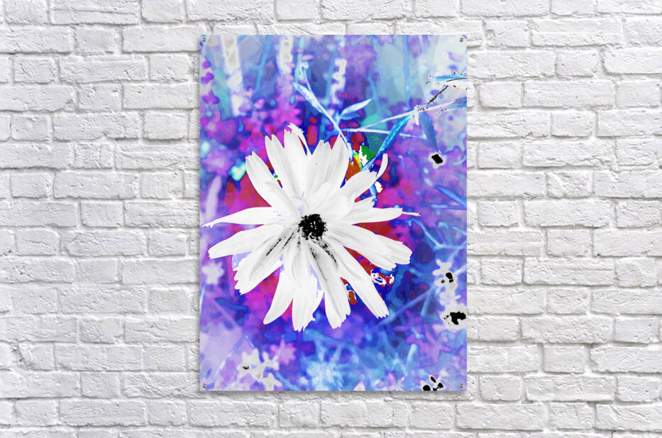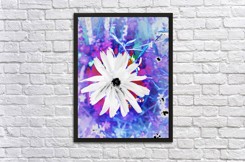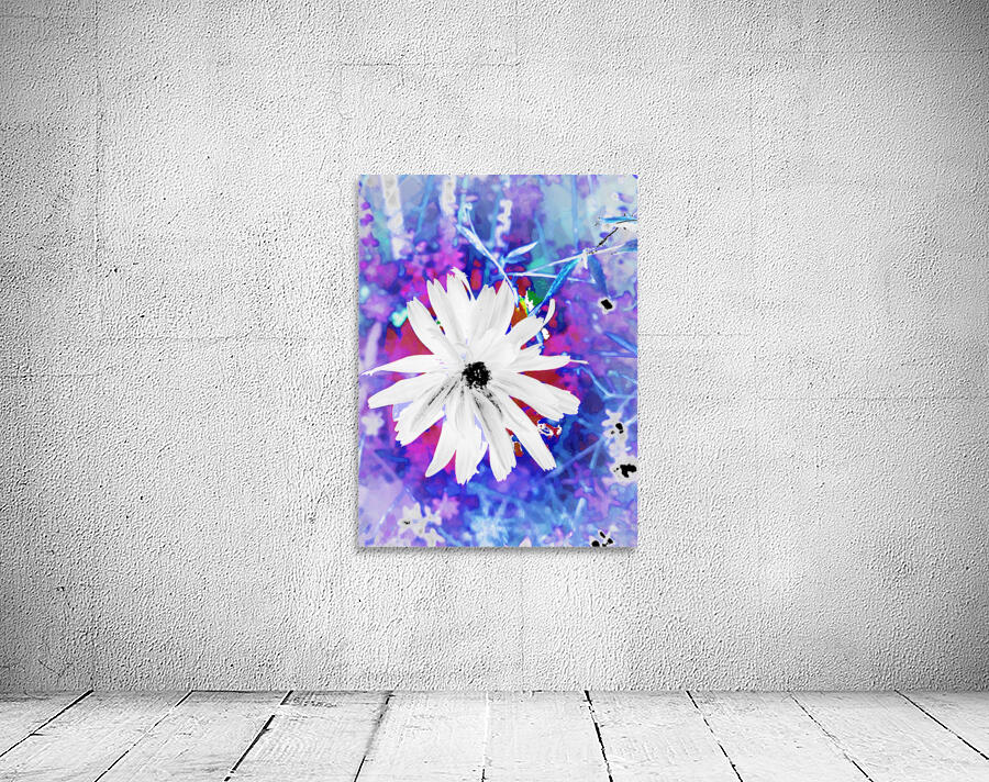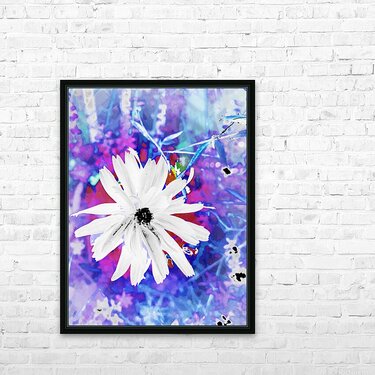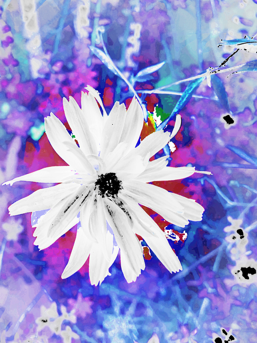 Originally a photo of a Daisy laterally digitally manipulated to create a stunning floral abstract. Features a large white Daisy prominently displayed against a vibrant background of blues and purples. The image has a surreal, almost psychedelic quality with its bold color contrasts.