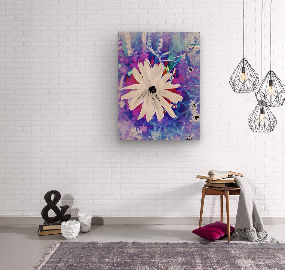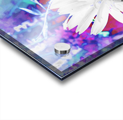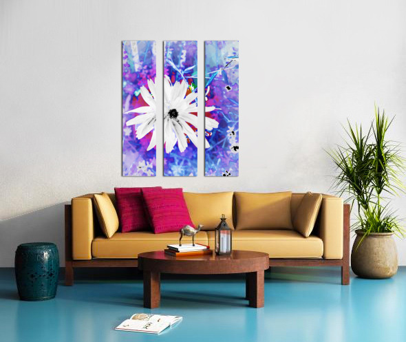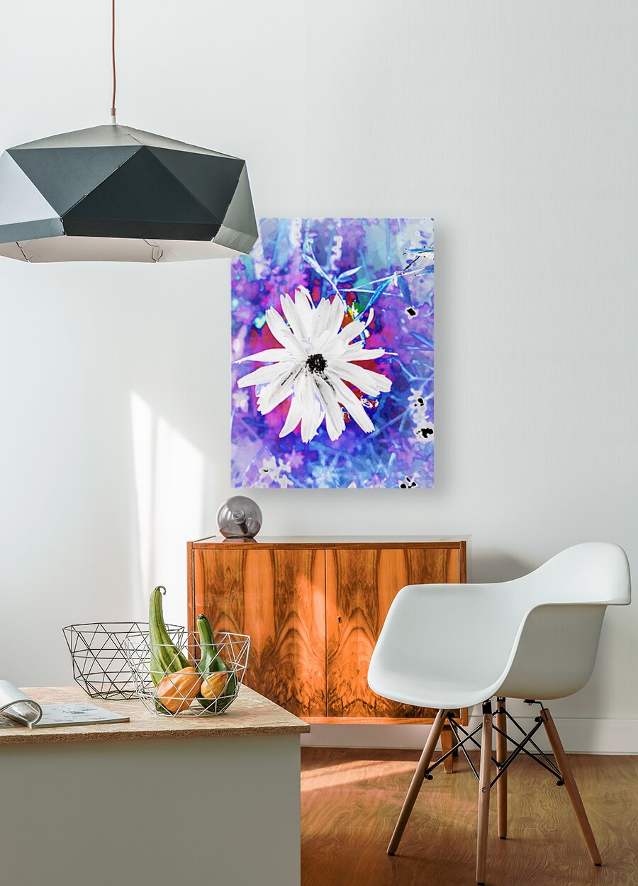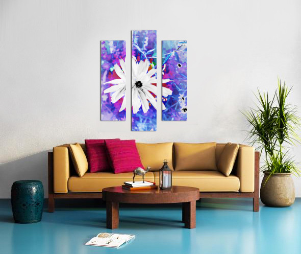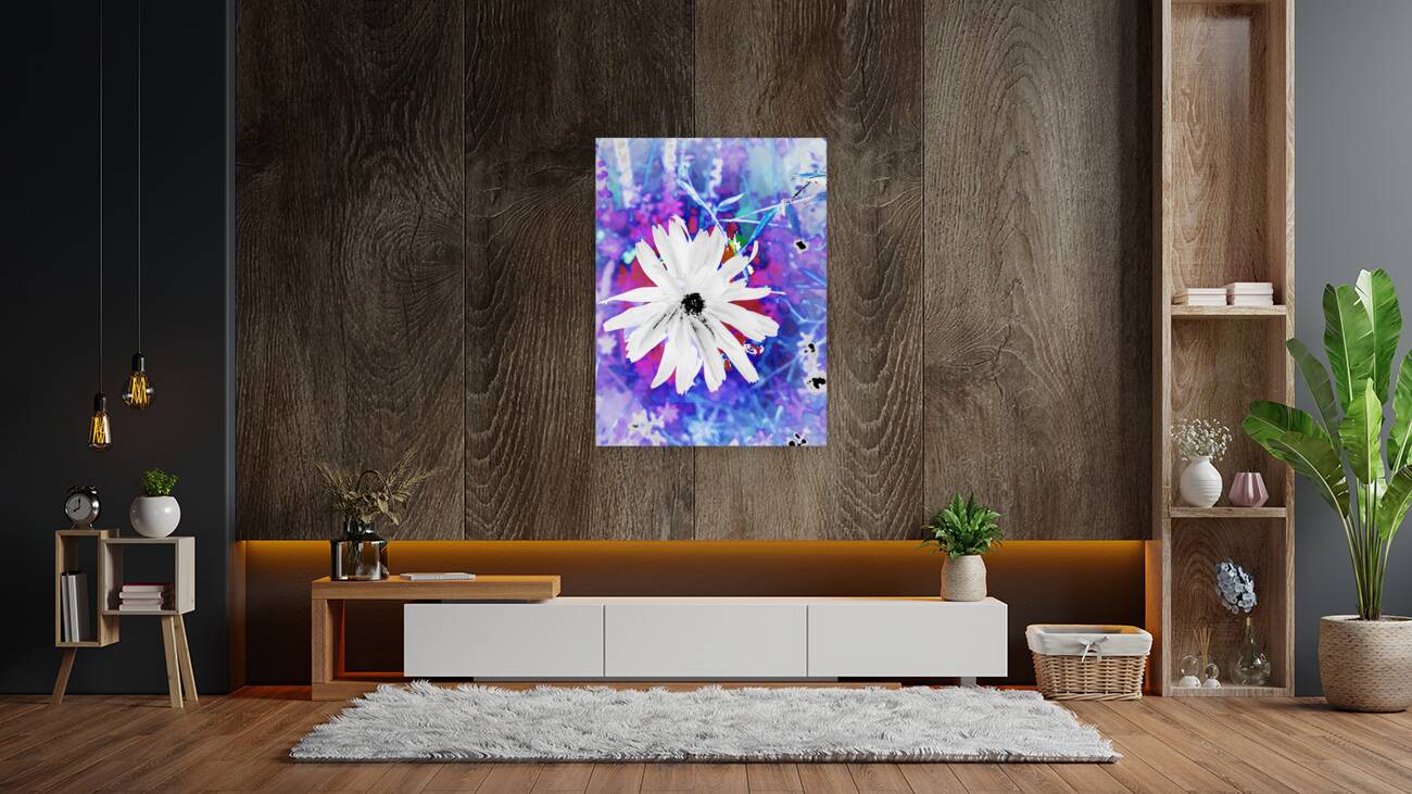 Originally a photo of a Daisy laterally digitally manipulated to create a stunning floral abstract. Features a large white Daisy prominently displayed against a vibrant background of blues and purples. The image has a surreal, almost psychedelic quality with its bold color contrasts.