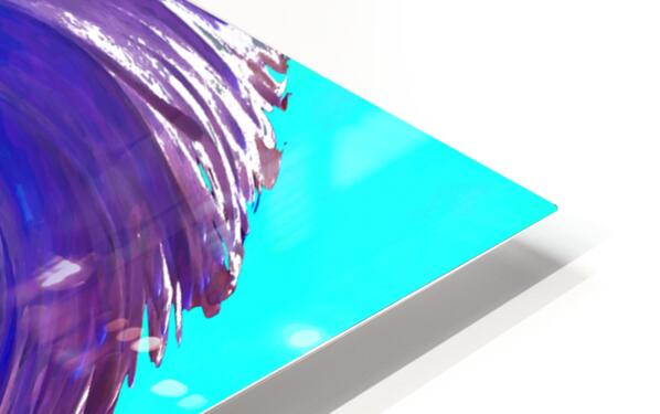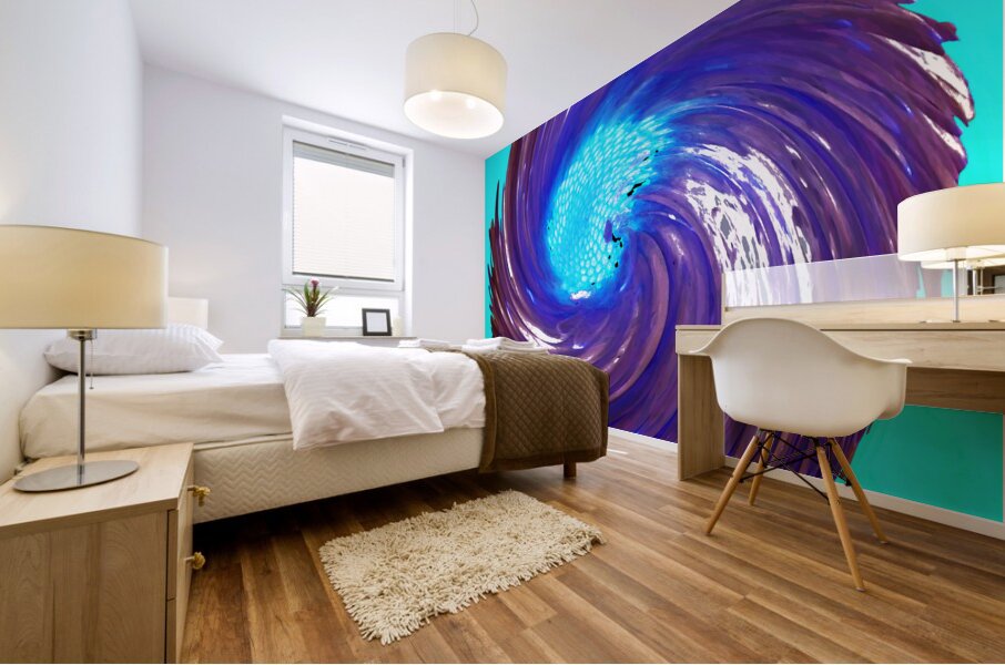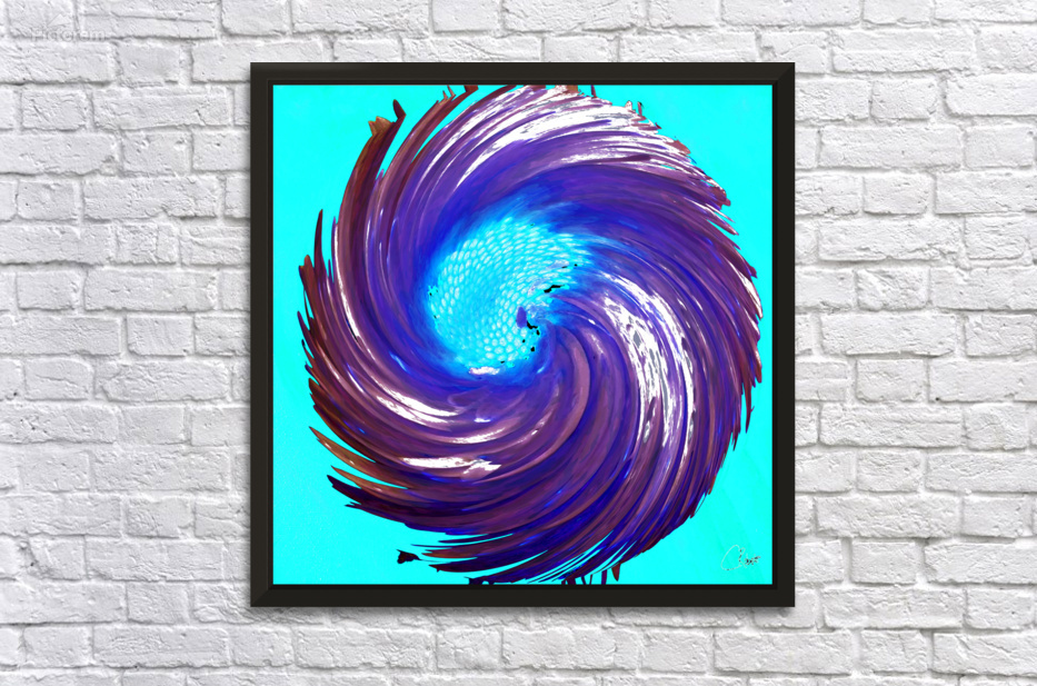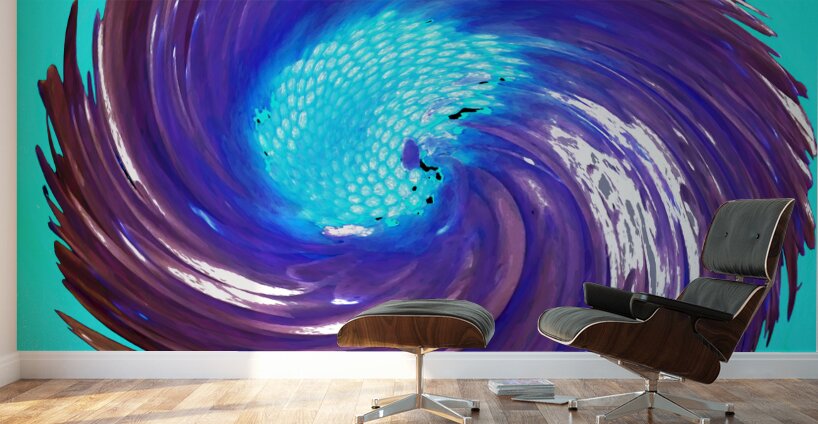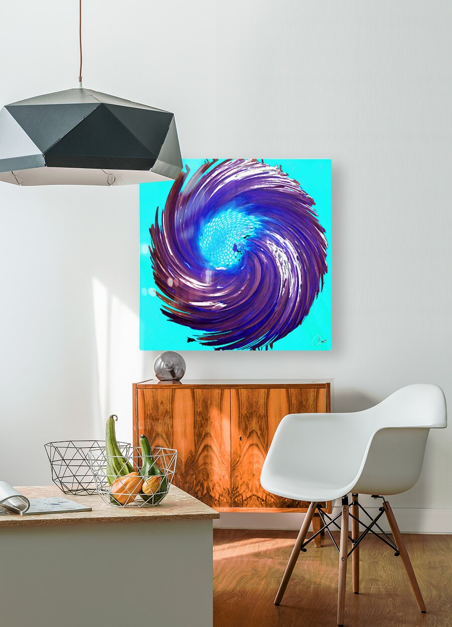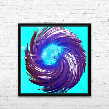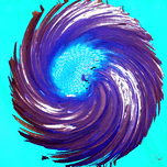 Originally a close up photo of a Daisy flower and a hand painted acrylic, laterally combined and digitally manipulated. Features a vibrant spiral of deep purples and blues. Centers on a bright, light blue focal point, creating a dynamic, swirling effect. The contrasting colors and sweeping motion give a sense of energy and movement.