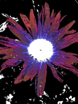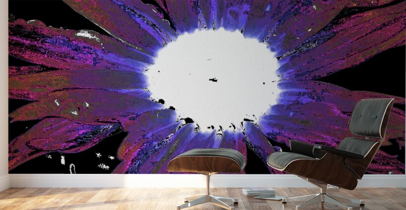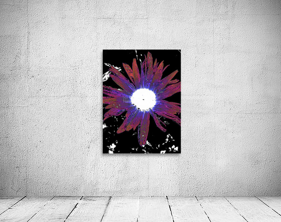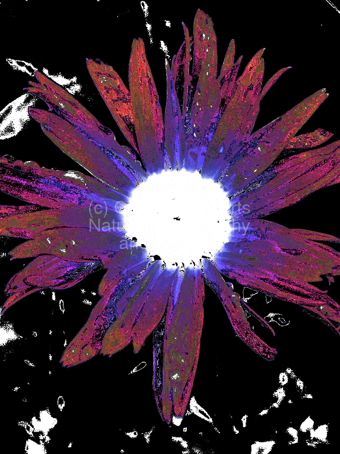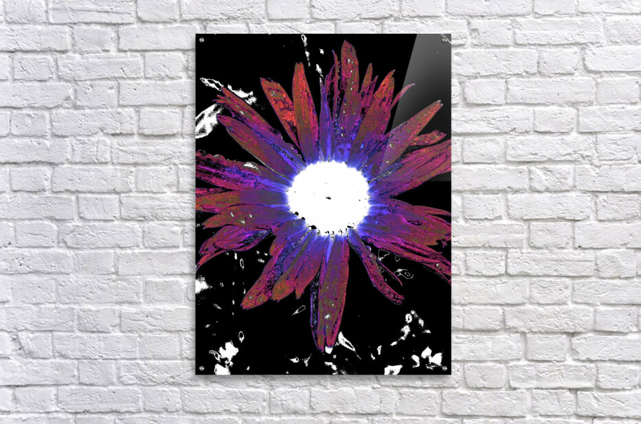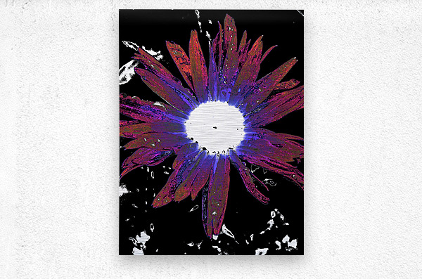 Originally a coloured close up photo of a Daisy flower laterally digitally manipulated into a stunning piece of contemporary floral art. Features a vibrant Daisy with elongated petals radiating from a bright white center set against a stark black background. The petals are predominantly red and purple, creating a striking contrast.