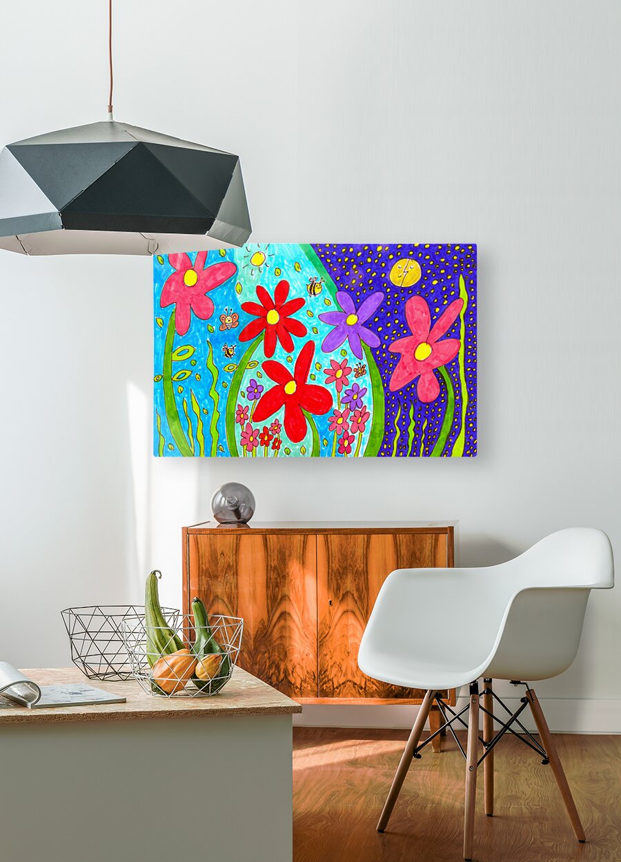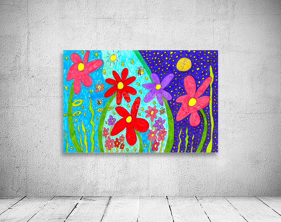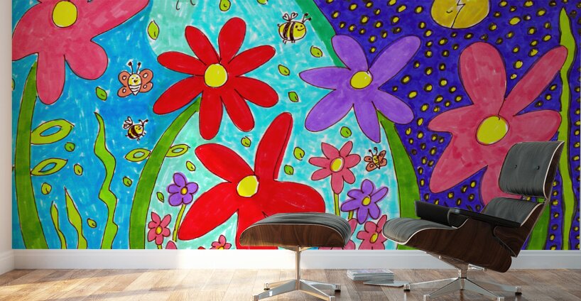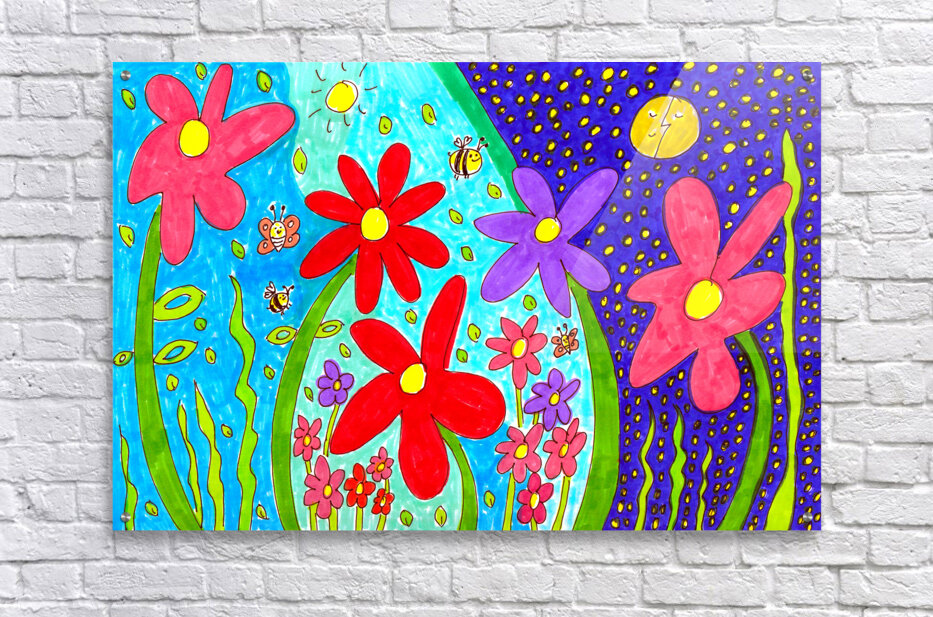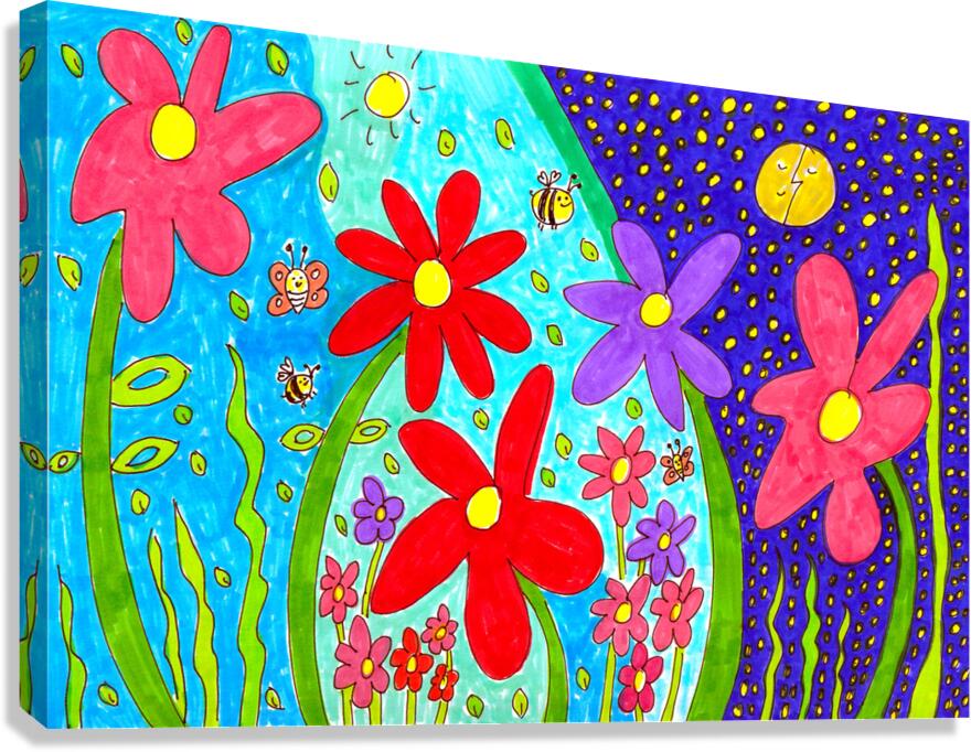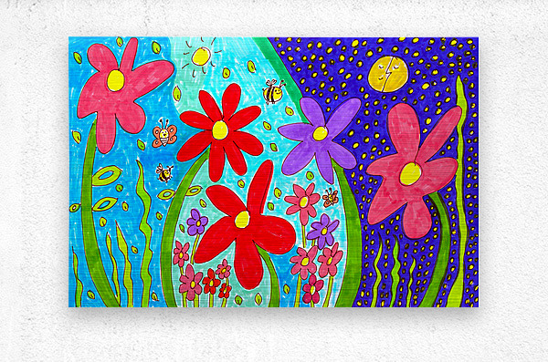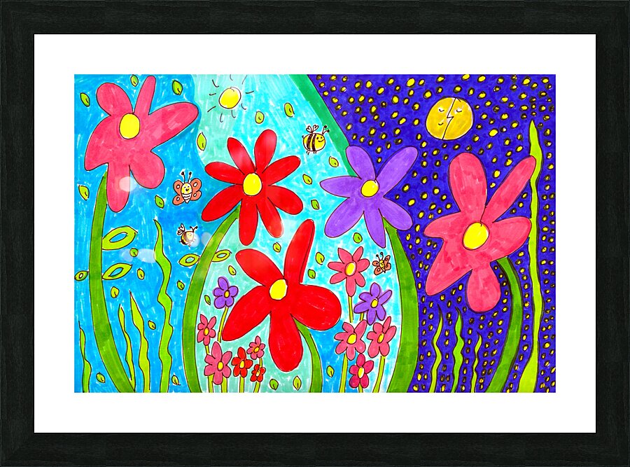 A hand drawn abstract created from imagination using coloured ink pens and paper. Vibrant flowers in red, purple, and pink dominate the foreground against a backdrop of a whimsical blue sky filled with yellow suns and stars. Bees and small flowers are interspersed throughout the scene, with this simple and playful quality.