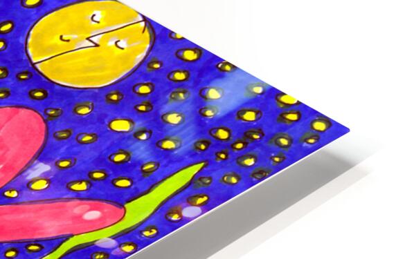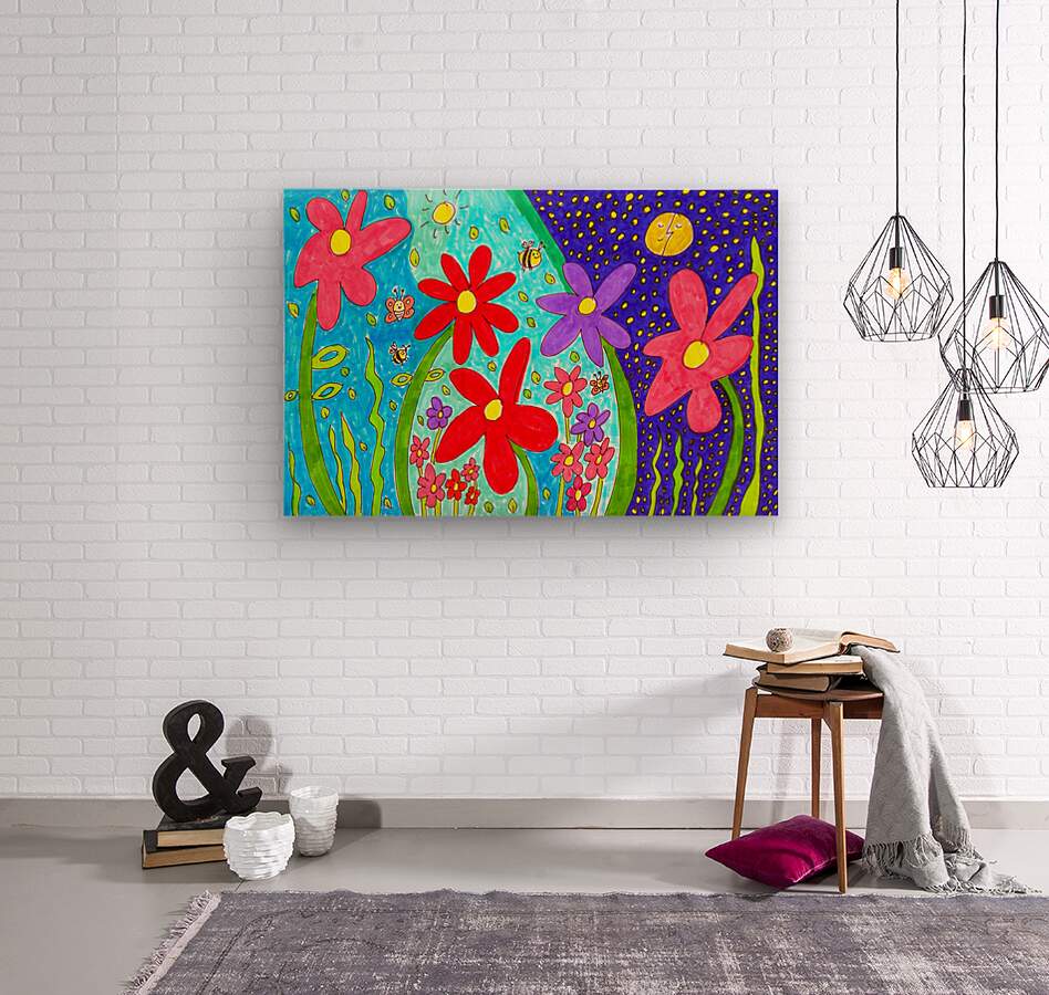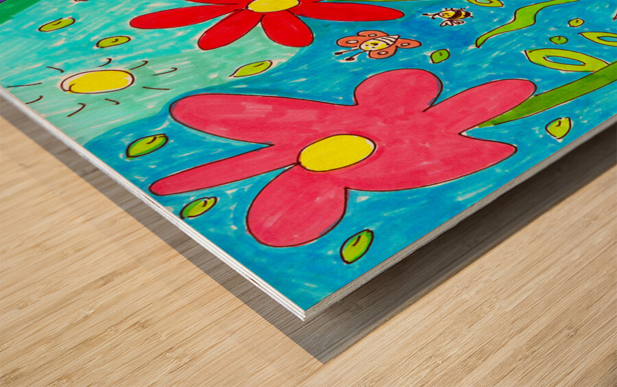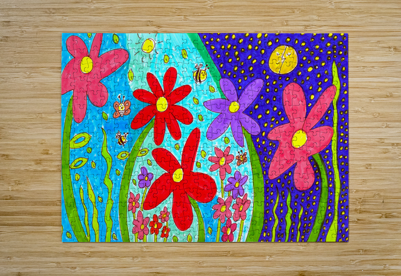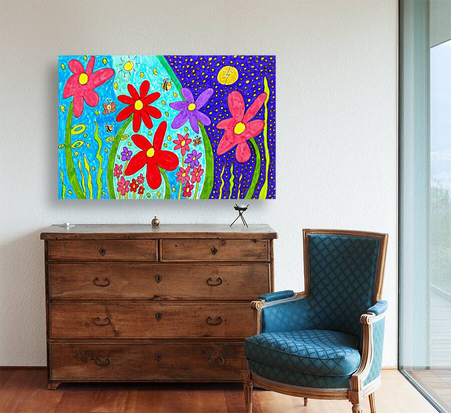 A hand drawn abstract created from imagination using coloured ink pens and paper. Vibrant flowers in red, purple, and pink dominate the foreground against a backdrop of a whimsical blue sky filled with yellow suns and stars. Bees and small flowers are interspersed throughout the scene, with this simple and playful quality.