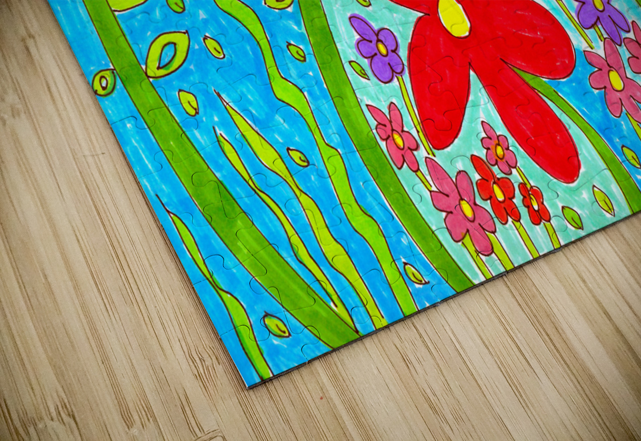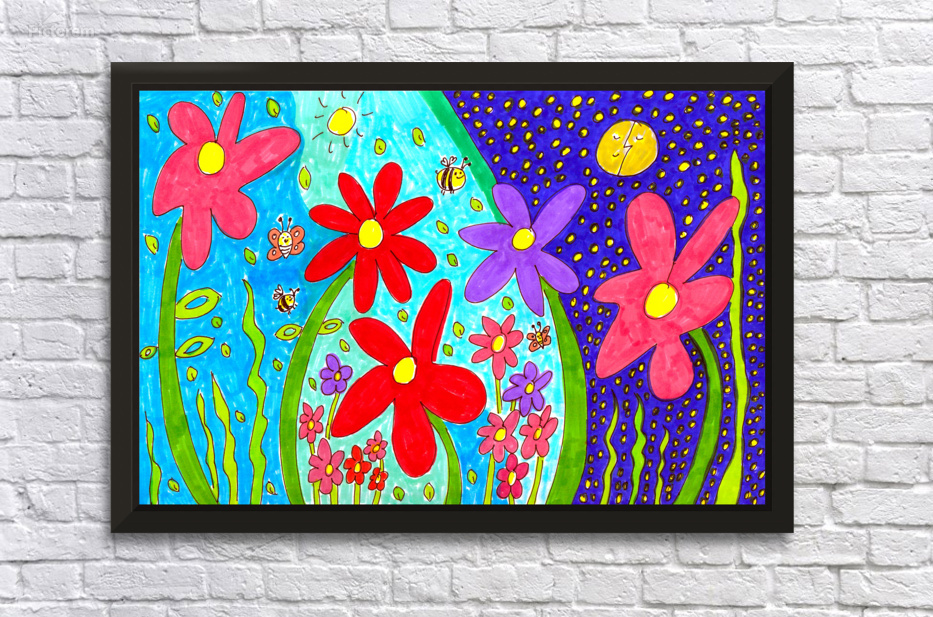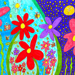A hand drawn abstract created from imagination using coloured ink pens and paper. Vibrant flowers in red, purple, and pink dominate the foreground aga...[+]