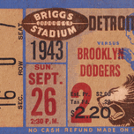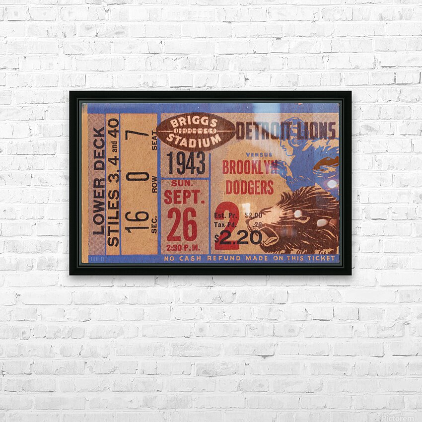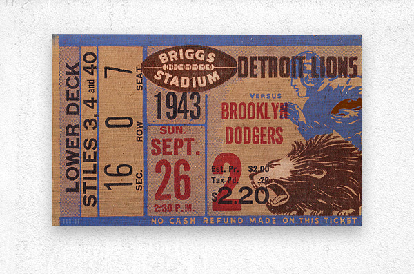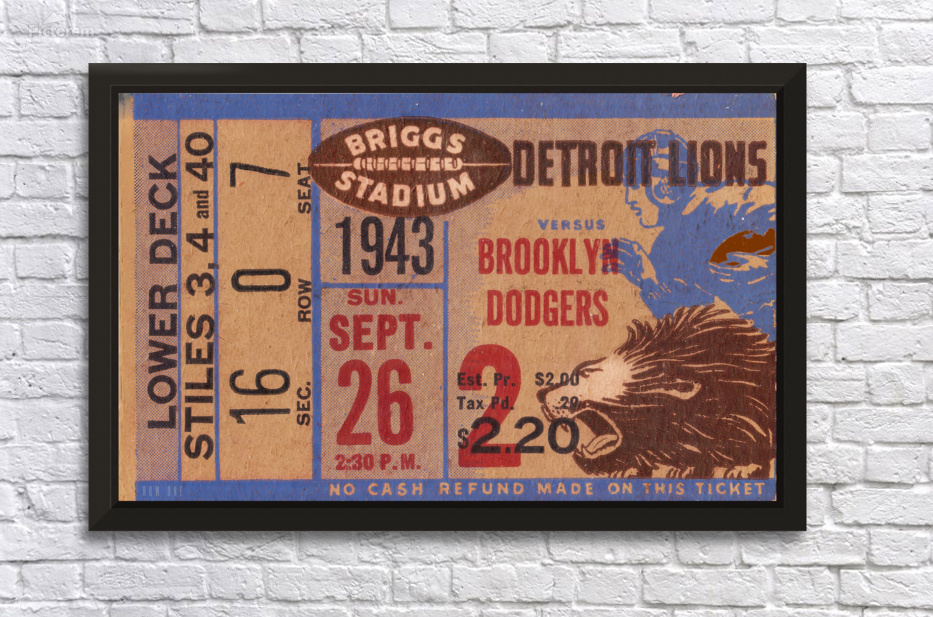 1943 Brooklyn Dodgers at Detroit Lions | Football Ticket Wall Art | Row One | Over 17,000 Historic Sports Prints | The Lions beat the Brooklyn Dodgers football team by the score of 27-0. This historic Detroit Lions ticket wall art will look fantastic in your home or office.