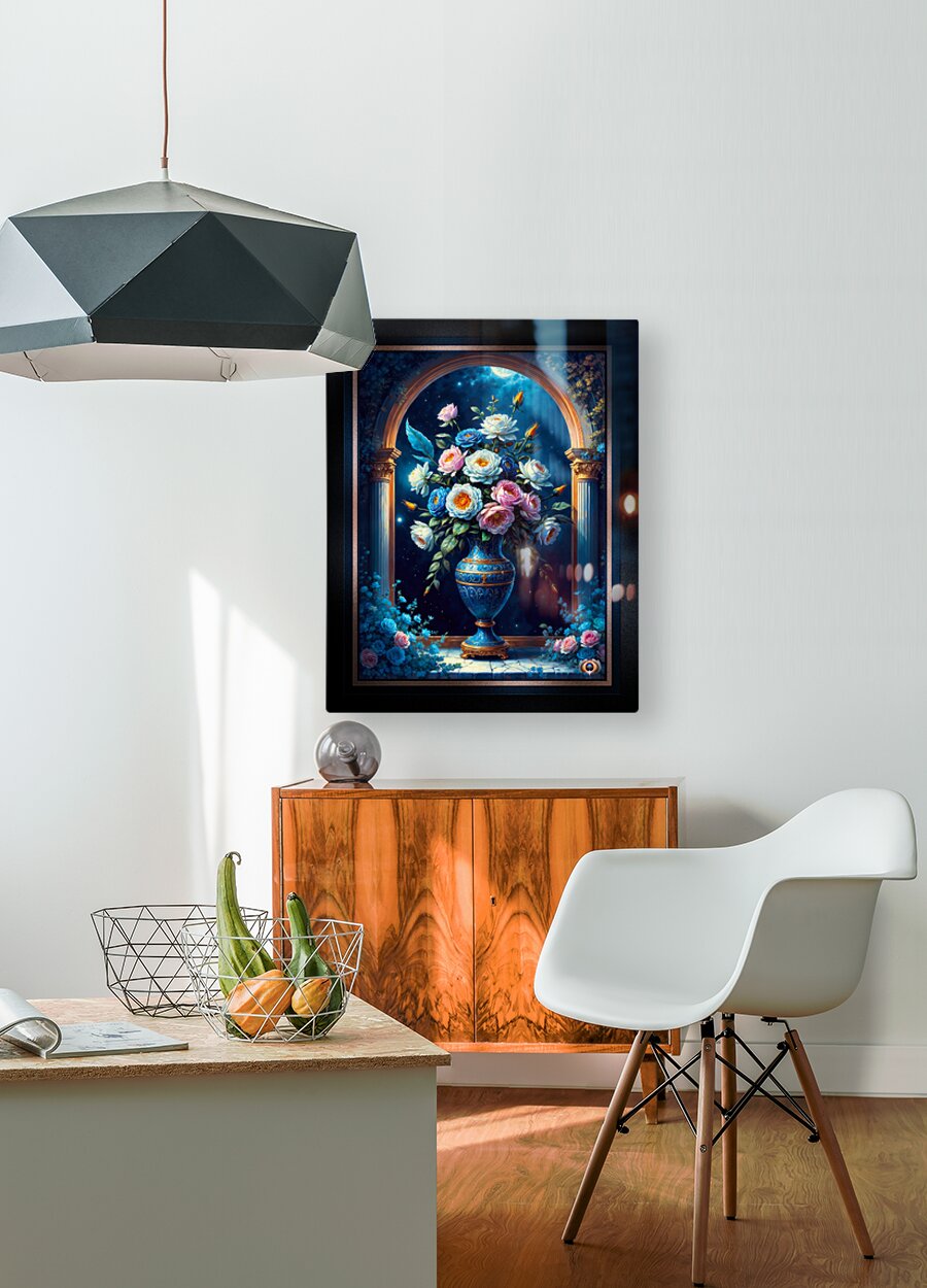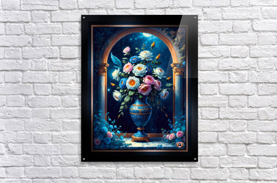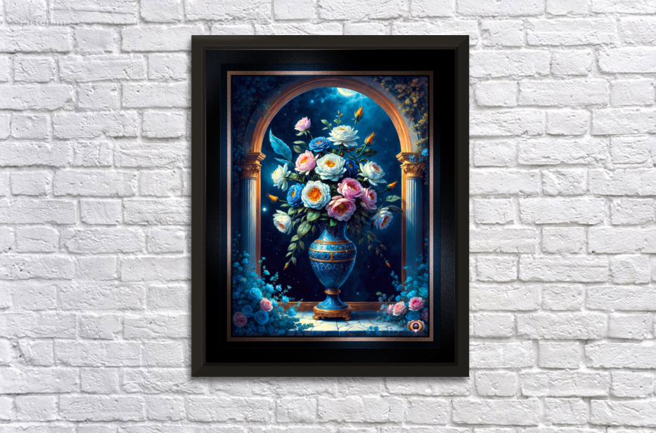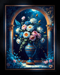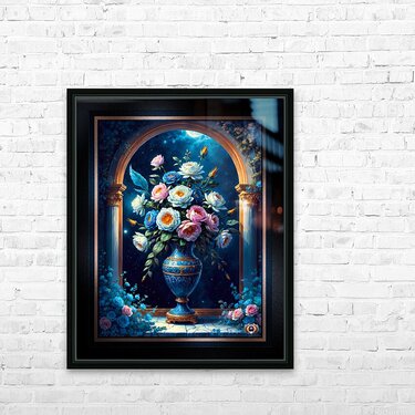 Glorious Floral Bouquet In A Majestic Blue Vase Under A Moonlit Sky Captivating AI Concept Art by Xzendor7 Wall Decor Frame