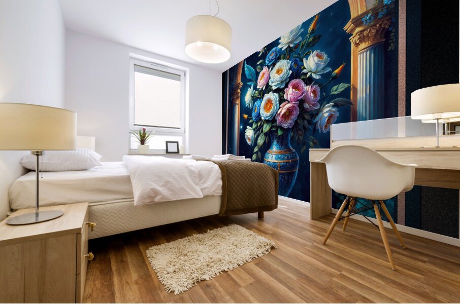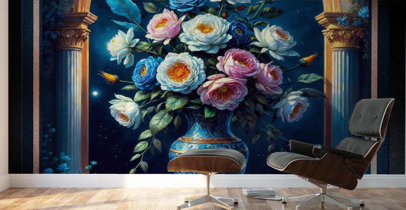 ABOUT THIS ARTWORK: GLORIOUS FLORAL BOUQUET IN A MAJESTIC BLUE VASE UNDER A MOONLIT SKY CAPTIVATING AI CONCEPT ART BY XZENDOR7