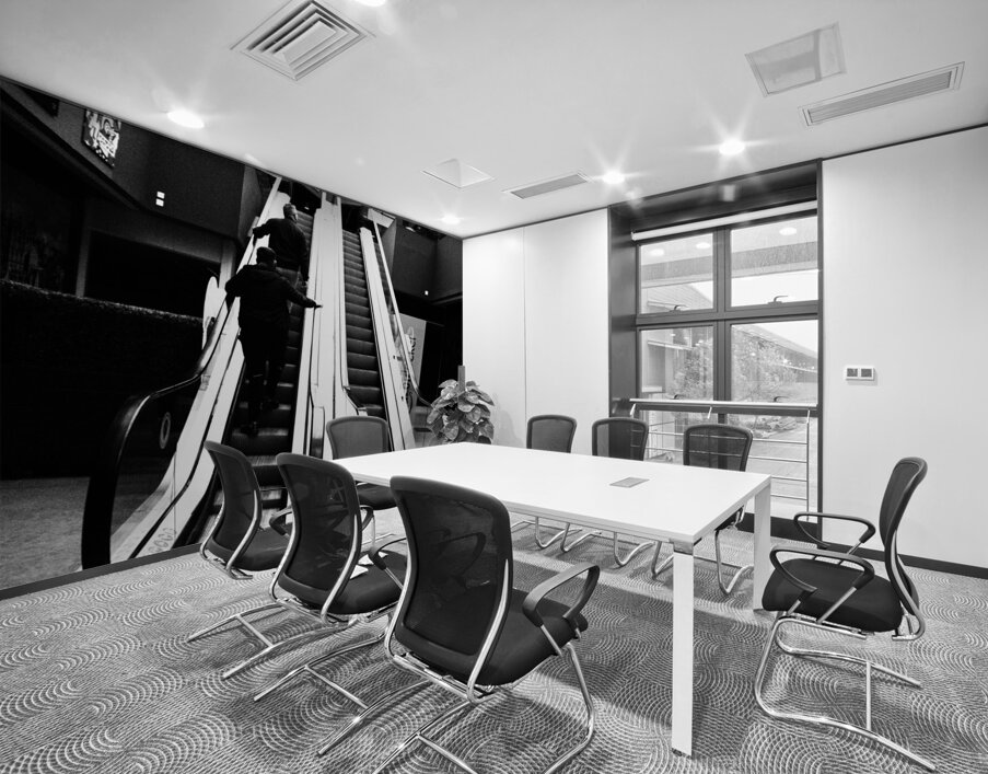 A black and white photo using an artistic filter to give a grainy effect, features two people ascending an escalator in a modern indoor setting, with contrasting lighting creating a dramatic effect. The area is surrounded by glass railings and artwork, adding to the contemporary atmosphere.