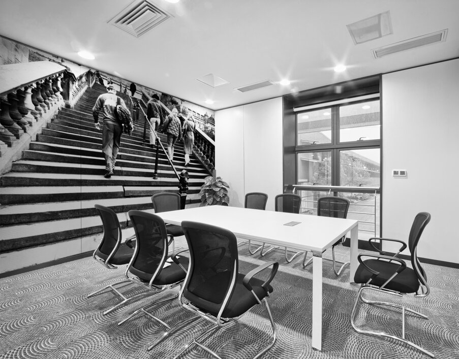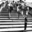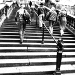 A black and white photo taken using a creative filter to give a grainy effect, features people ascending a wide staircase bordere...[+]