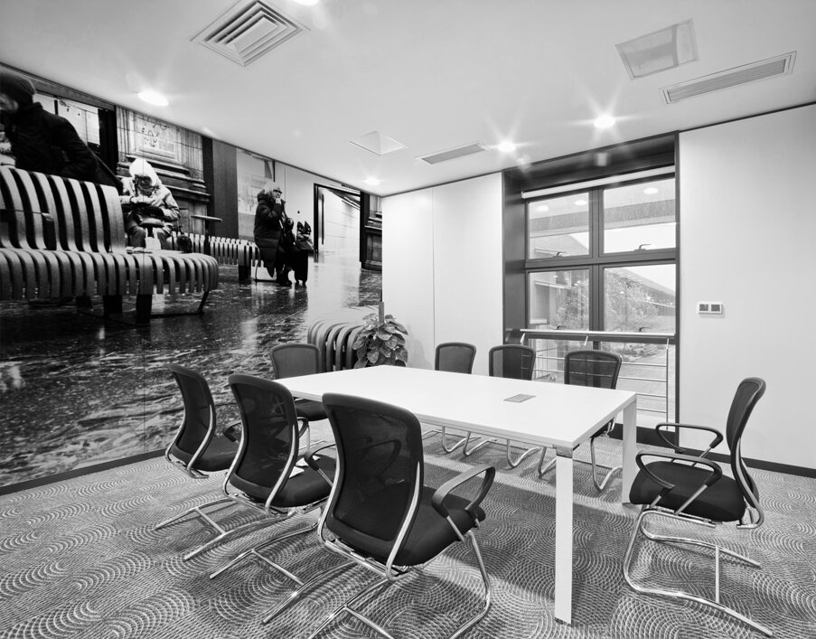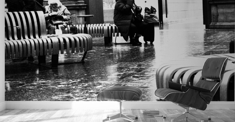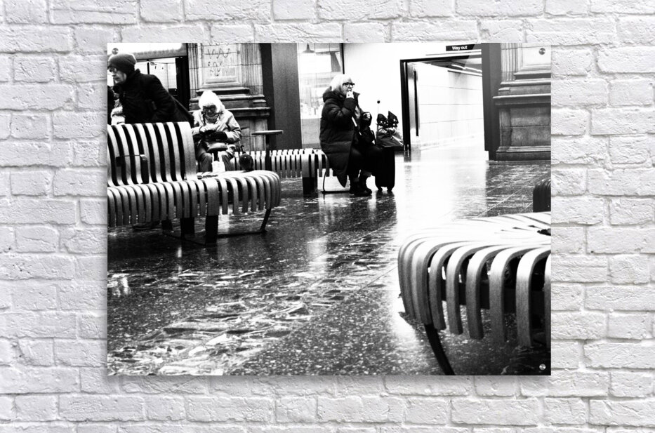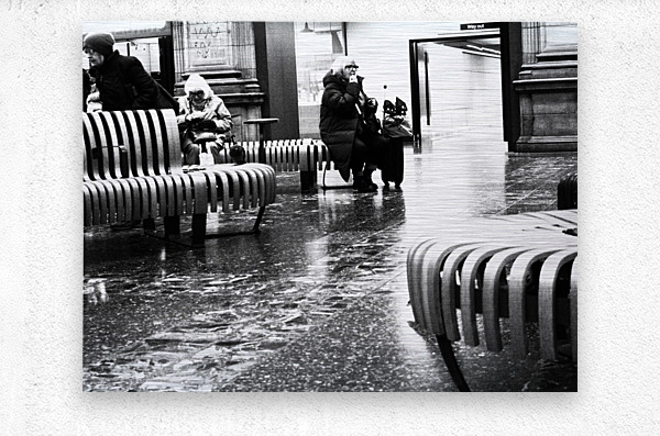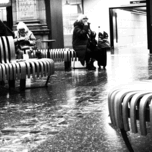 A monochrome photo taken using a creative filter to give a grainy effect, features a black and white scene capturing people sitting on curved wooden benches in Edinburgh Waverley's train station. The floor reflects light, adding to the contrast of the image, while a sign pointing to an exit can be seen in the background.
