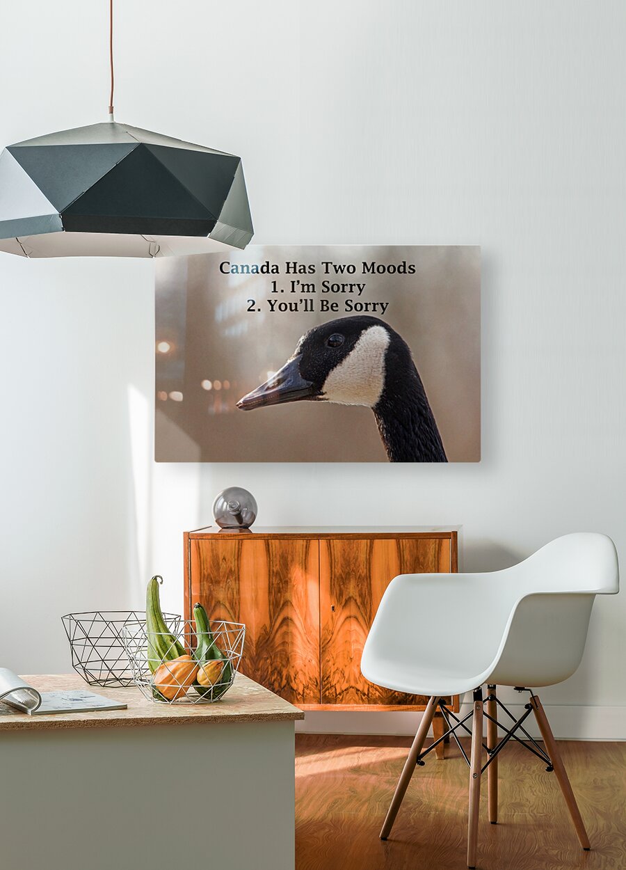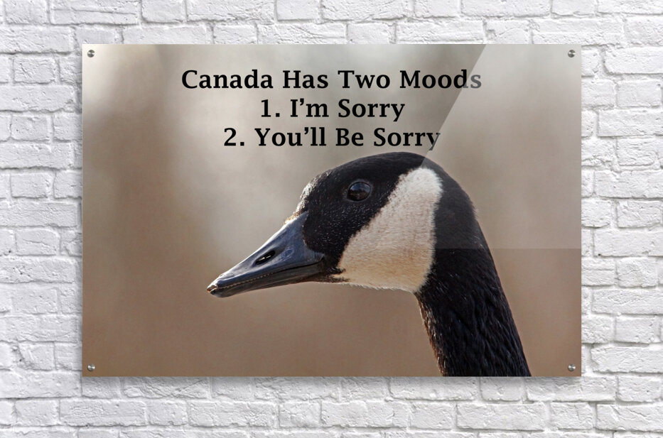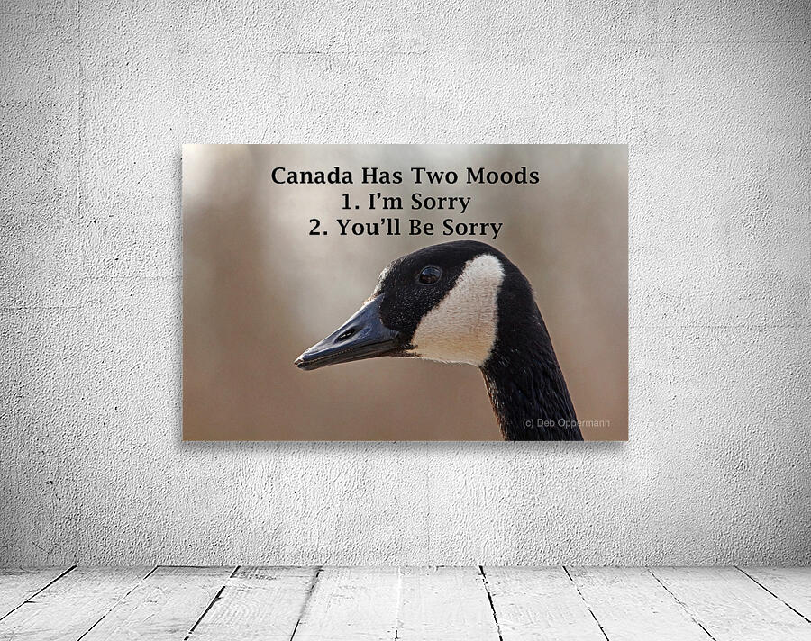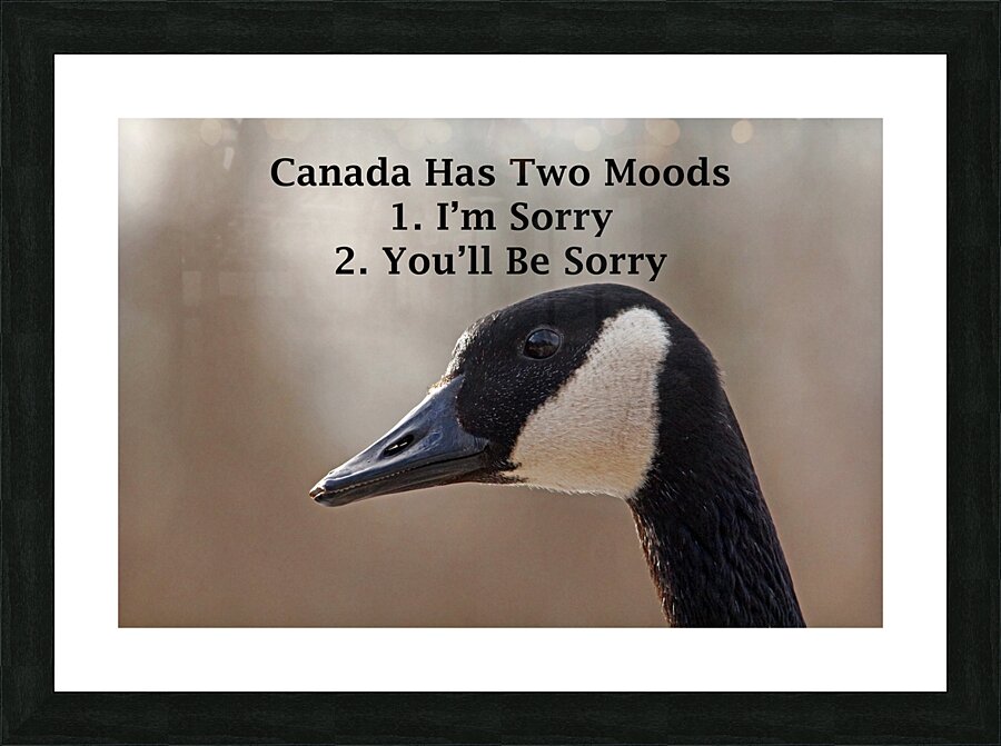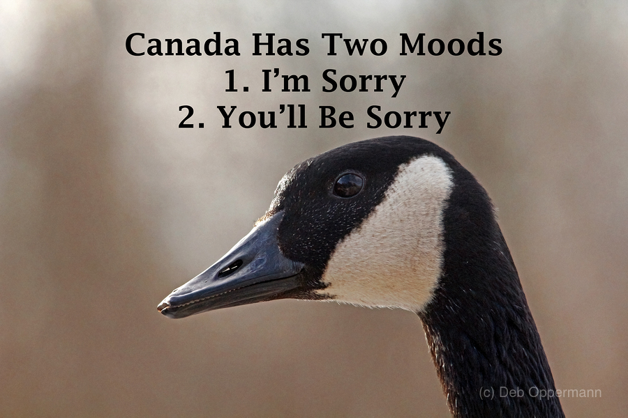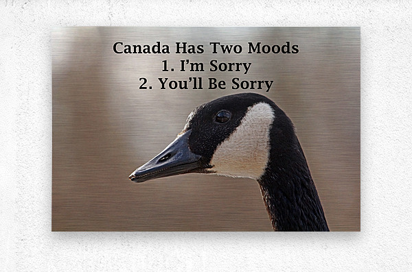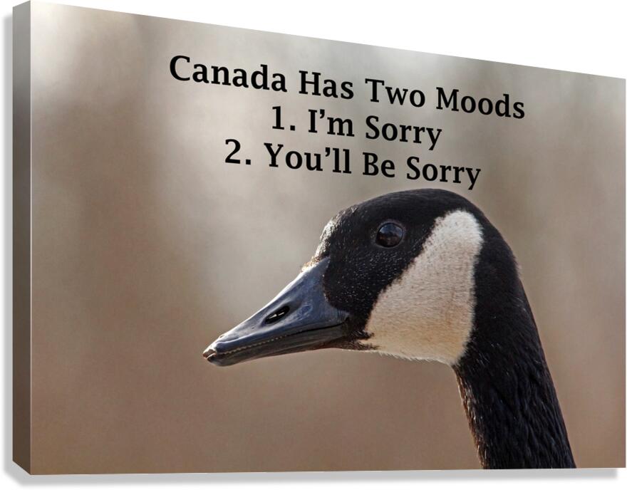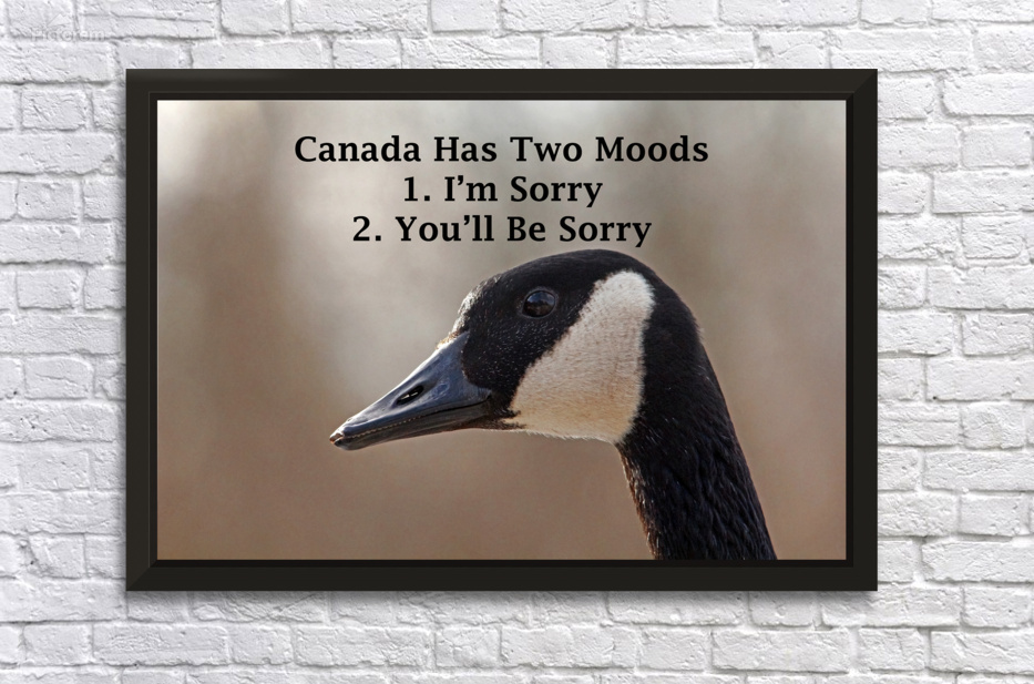 "Canadian Moods" by Debbie Oppermann. A close-up of a Canadian Goose is accompanied by text about Canada's moods. The image plays on stereotypes, combining an animal known for its assertiveness with a classic Canadian apology joke. Canada has two moods, I'm sorry and you'll be sorry.