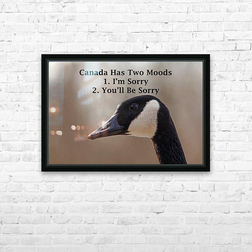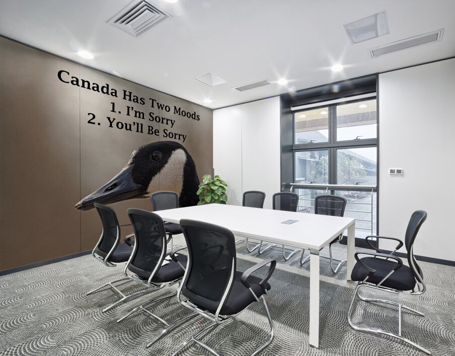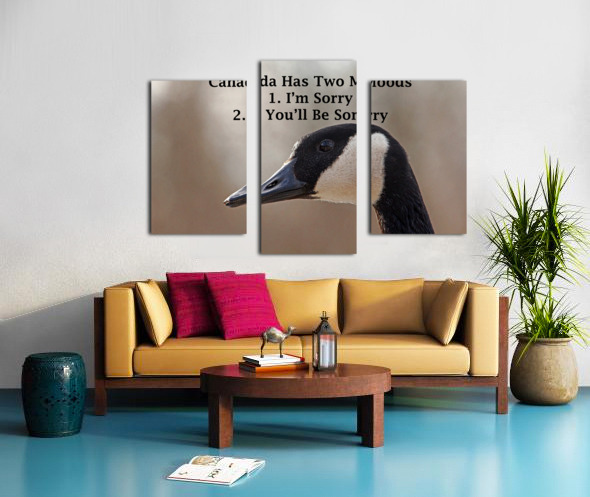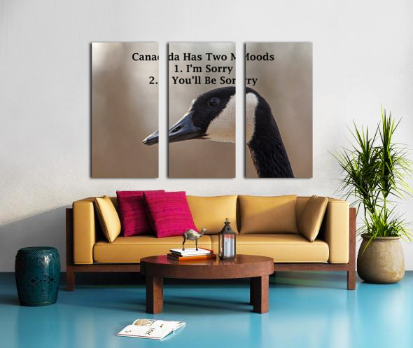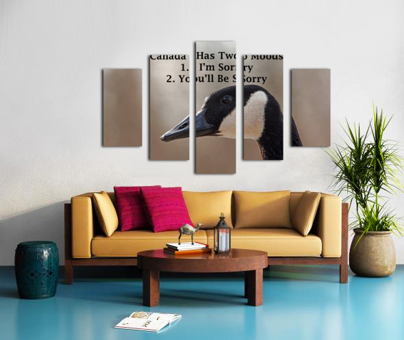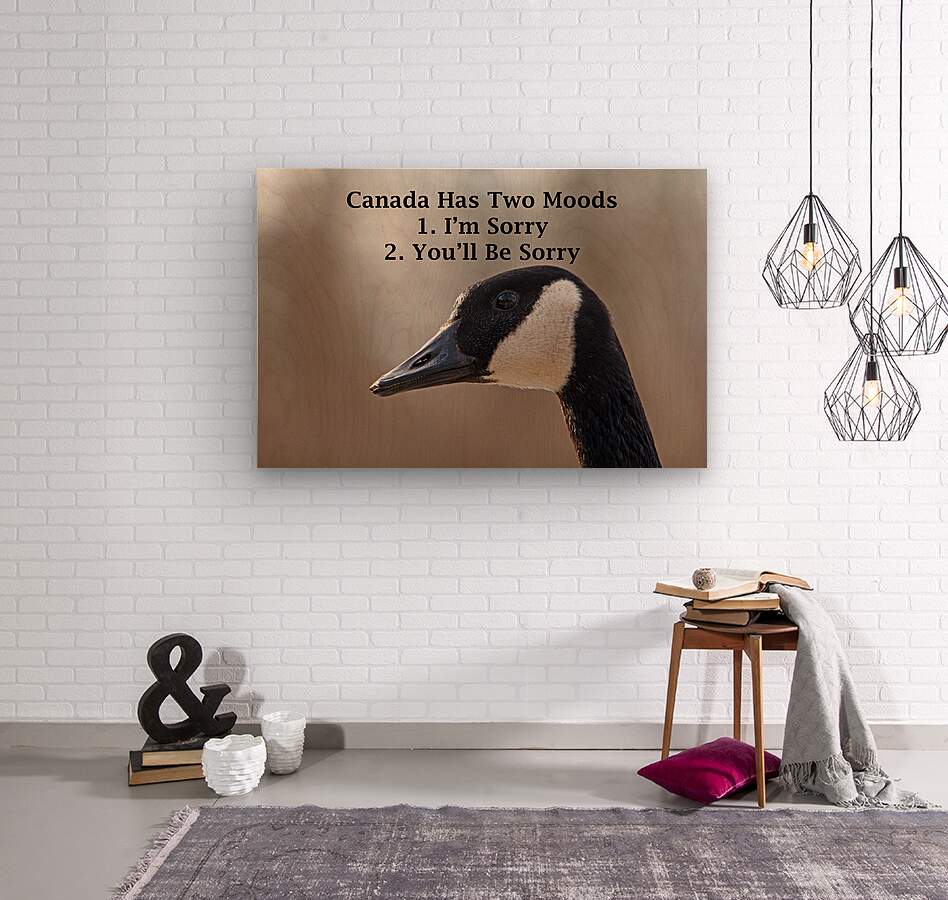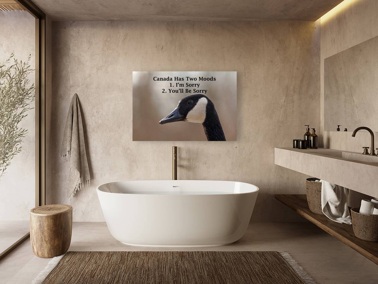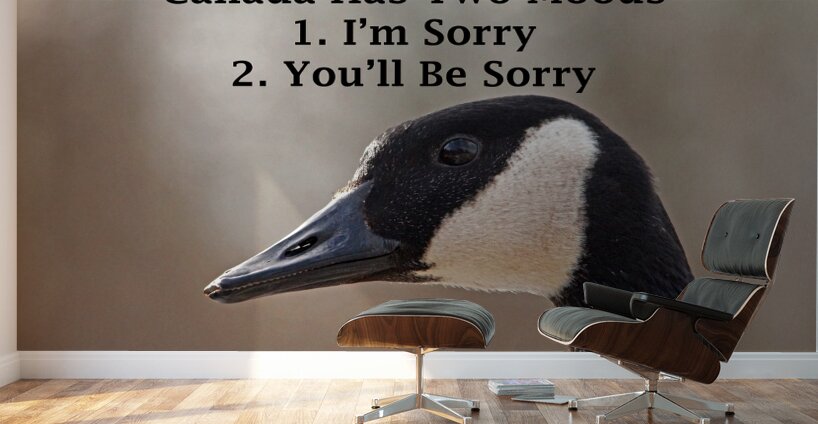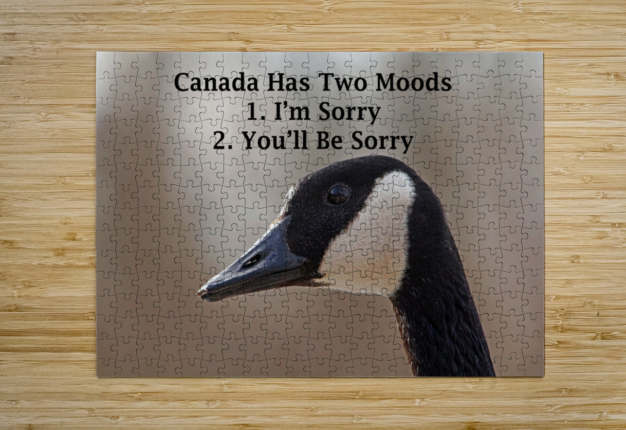 "Canadian Moods" by Debbie Oppermann. A close-up of a Canadian Goose is accompanied by text about Canada's moods. The image plays on stereotypes, combining an animal known for its assertiveness with a classic Canadian apology joke. Canada has two moods, I'm sorry and you'll be sorry.