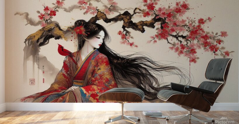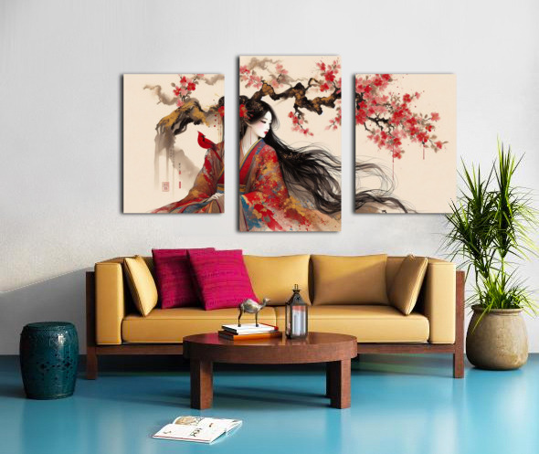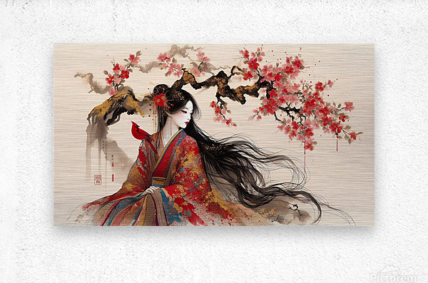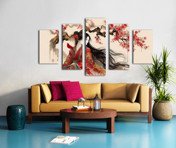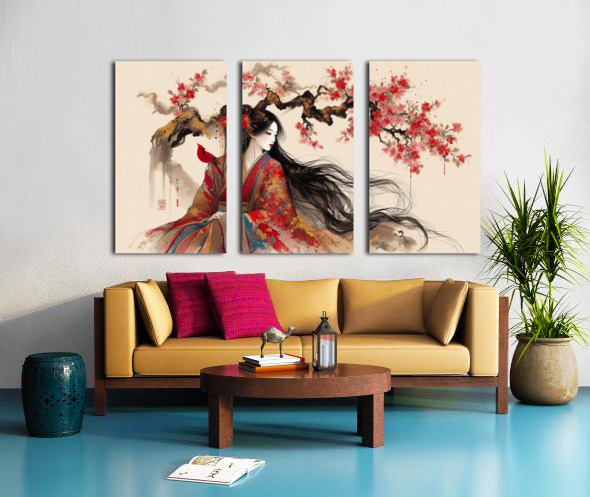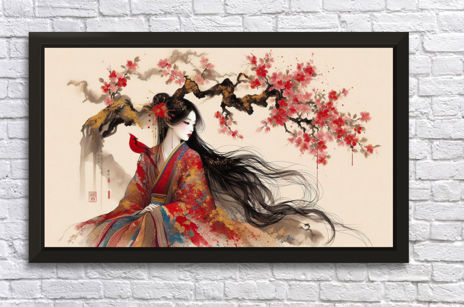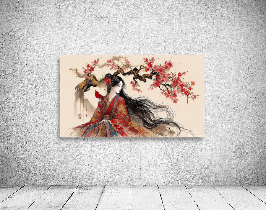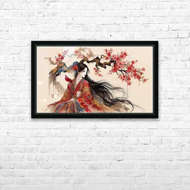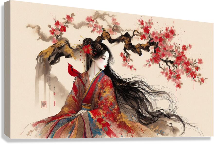 This exquisite artwork captures the elegance of a traditional Asian-inspired portrait, featuring a graceful woman adorned in a richly detailed kimono with flowing black hair. Delicate cherry blossoms intertwine with golden brushstrokes, creating a harmonious fusion of nature and beauty. The soft color palette and intricate design make this piece perfect for home décor, adding a touch of sophistication and tranquility to any space.