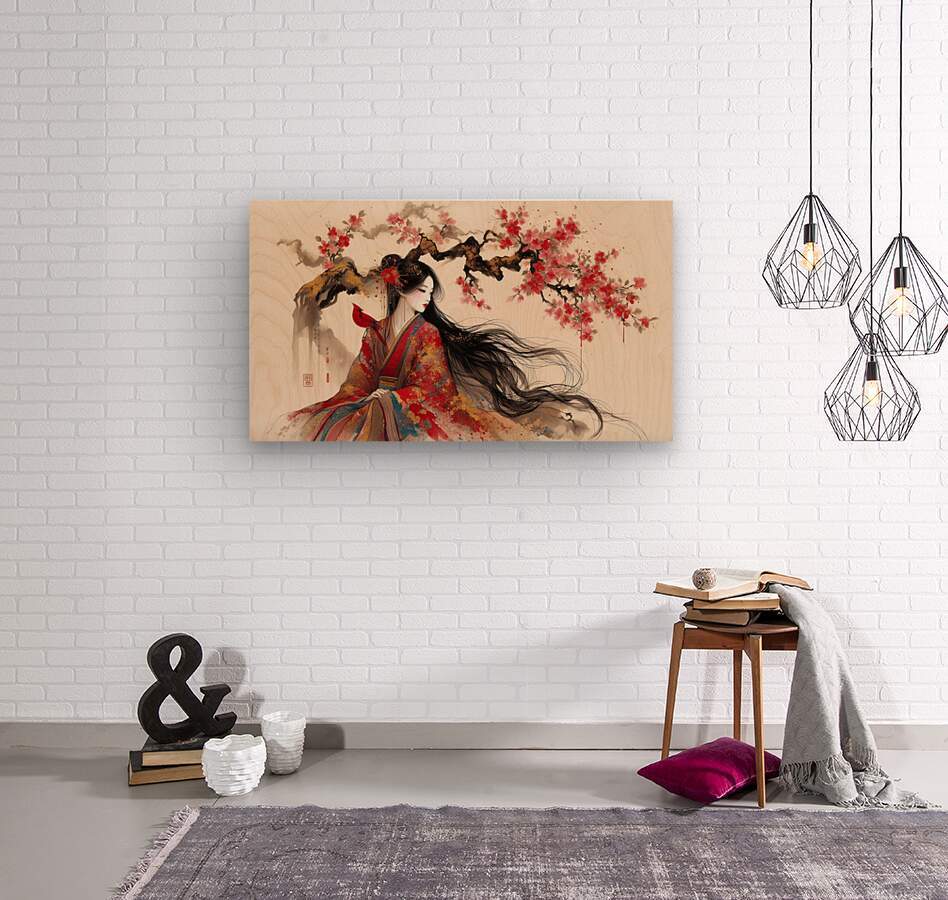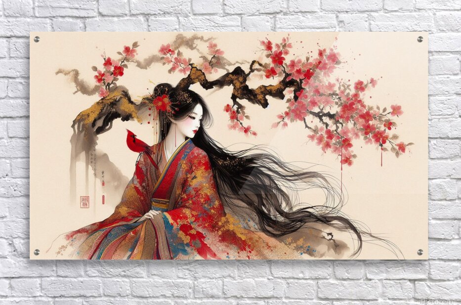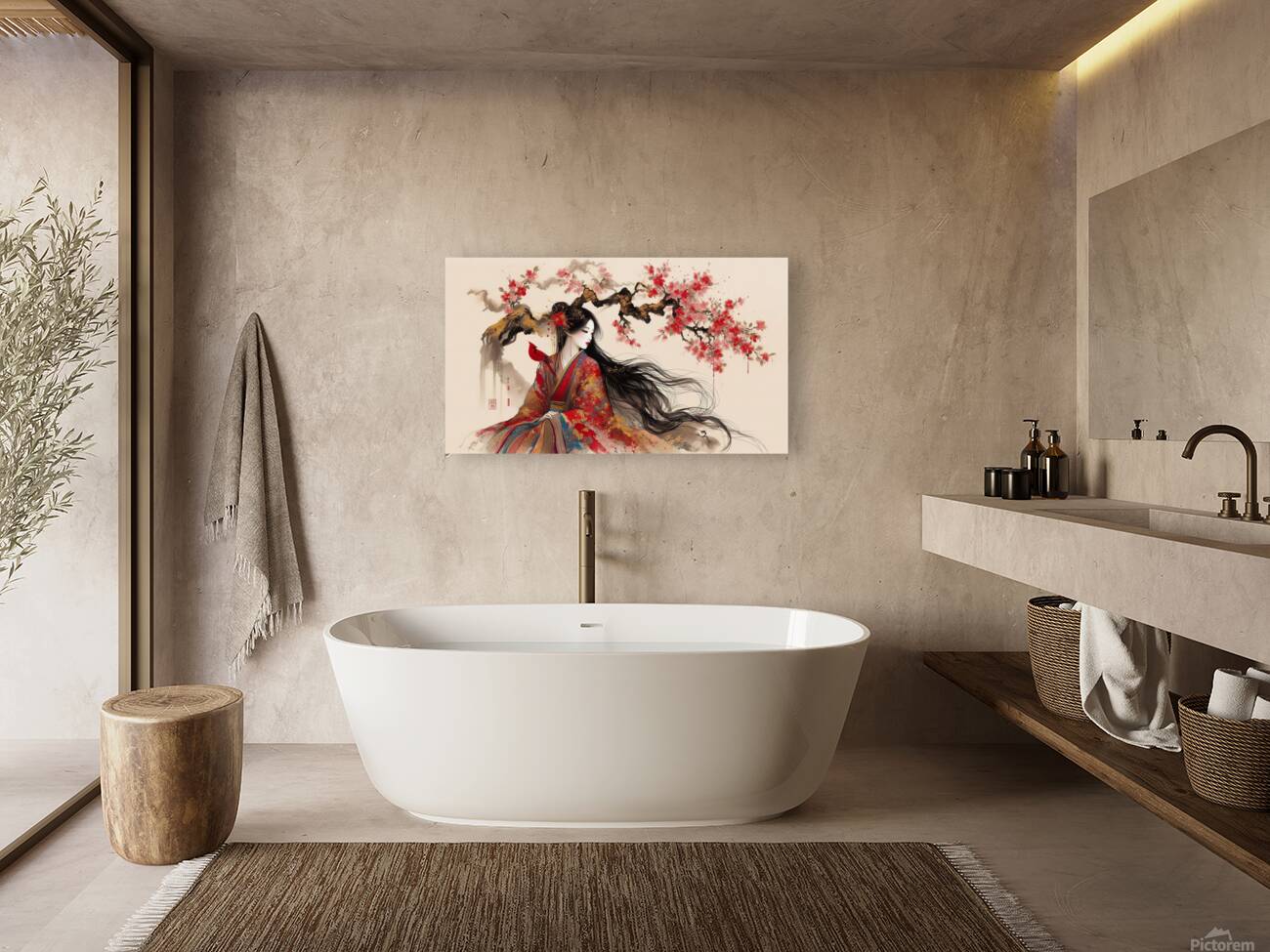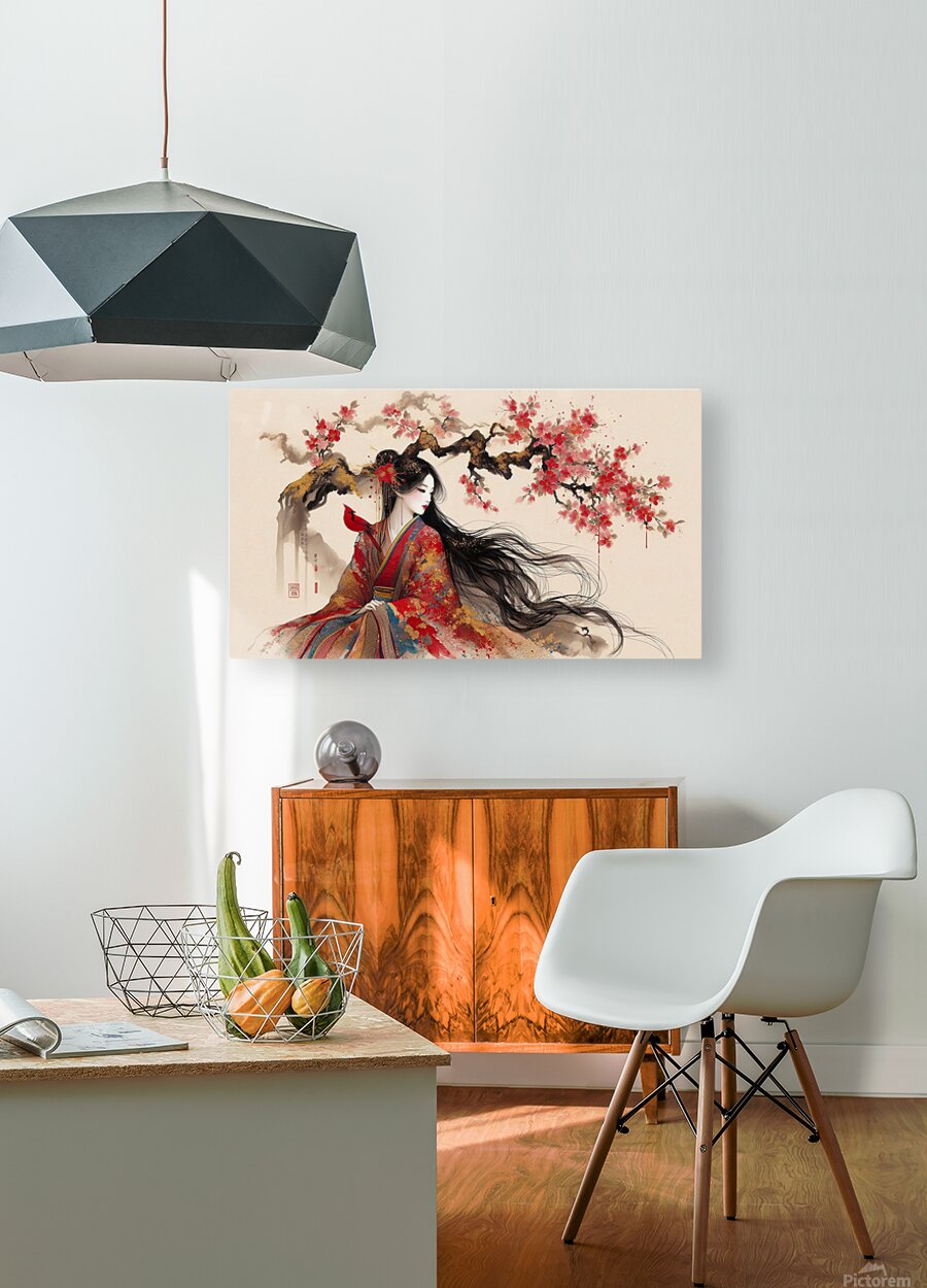 This exquisite artwork captures the elegance of a traditional Asian-inspired portrait, featuring a graceful woman adorned in a richly detailed kimono with flowing black hair. Delicate cherry blossoms intertwine with golden brushstrokes, creating a harmonious fusion of nature and beauty. The soft color palette and intricate design make this piece perfect for home décor, adding a touch of sophistication and tranquility to any space.