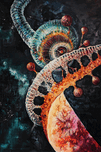 Microscopic and cosmic forms intertwine in a vibrant dance of life and creation. Technique: Acrylic on canvas, influenced by Ernst Haeckel and David Goodsell Artist's Intent: To evoke a sense of wonder and awe at the intricate beauty and complexity of life at all scales, from the microscopic to the cosmic. Contribution: Appeals to art enthusiasts interested in science, biology, and abstract art. Strong potential for both art prints and original sales. Influences: Detailed depiction of cellular structures and cosmic elements, blending scientific accuracy with artistic interpretation. Meticulous detailing and vibrant color palette.