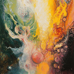 Abstract depiction of a cosmic genesis, with organic forms emerging from swirling colors. Technique: Acrylic on canvas, influenced by Yves Tanguy and...[+]