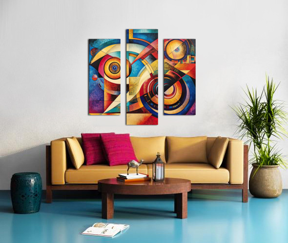 Dynamic interplay of geometric forms and cosmic motifs. Technique: Acrylic on canvas, influenced by Wassily Kandinsky and Fernand Léger Artist's Intent: To evoke a sense of cosmic order and dynamic movement through geometric abstraction. Contribution: Appeals to collectors of abstract art, geometric abstraction, and mid-century modern design. Influences: Geometric abstraction with intersecting circles, arcs, and planes; textured color fields; precise lines and shapes.