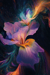 Two luminous irises against a cosmic backdrop, blending botanical detail with surreal atmosphere. Technique: Digital painting, influenced by Georgia O'Keeffe and Claude Monet Artist's Intent: To evoke a sense of wonder and awe by juxtaposing the delicate beauty of flowers with the vastness of space. Contribution: Appeals to those interested in botanical art, digital art, and surreal imagery. Strong potential for prints, home décor, and digital displays. Influences: Detailed rendering of irises with vibrant, otherworldly colors and cosmic background. Blend of botanical illustration and digital painting techniques.