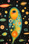 A large, amoeba-like form filled with colorful circles and dots floats in a black space populated by smaller, similar shapes. Technique: Watercolor o...[+]