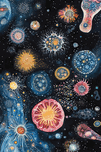 A vibrant depiction of microorganisms floating in a cosmic expanse. Technique: Watercolor on paper, influenced by Ernst Haeckel and Maria Sibylla Mer...[+]