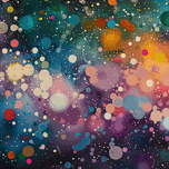 Dreamy cosmic landscape of swirling colors and light Technique: Acrylic on canvas, influenced by Wassily Kandinsky and Agnes Martin Artist's Intent: To evoke a sense of wonder and awe, capturing the beauty and mystery of the cosmos through abstract expression. Contribution: High market appeal due to its dreamy, evocative nature. Appeals to collectors of abstract art and those interested in cosmic themes. Influences: Layered application of acrylic paint, creating a luminous, depth-filled effect. Use of varying circle sizes and densities to suggest cosmic movement