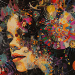 Dreamlike portrait infused with cosmic and mechanical elements, exploring themes of identity and the subconscious. Technique: Mixed media on canvas, influenced by Gustav Klimt and Robert Rauschenberg Artist's Intent: To evoke a sense of wonder and introspection, inviting viewers to explore the mysteries of the inner self and the cosmos. Contribution: Appeals to collectors interested in contemporary portraiture, surrealism, and mixed media art. Strong potential for gallery exhibitions and art fairs. Influences: Collage and digital painting techniques layered to create a dynamic, multi-faceted portrait integrated with cosmic and mechanical elements.