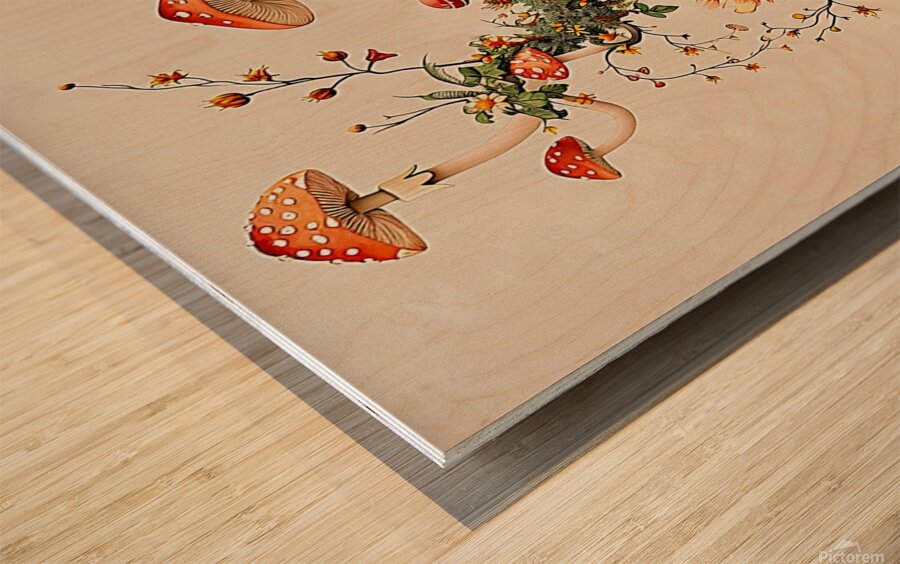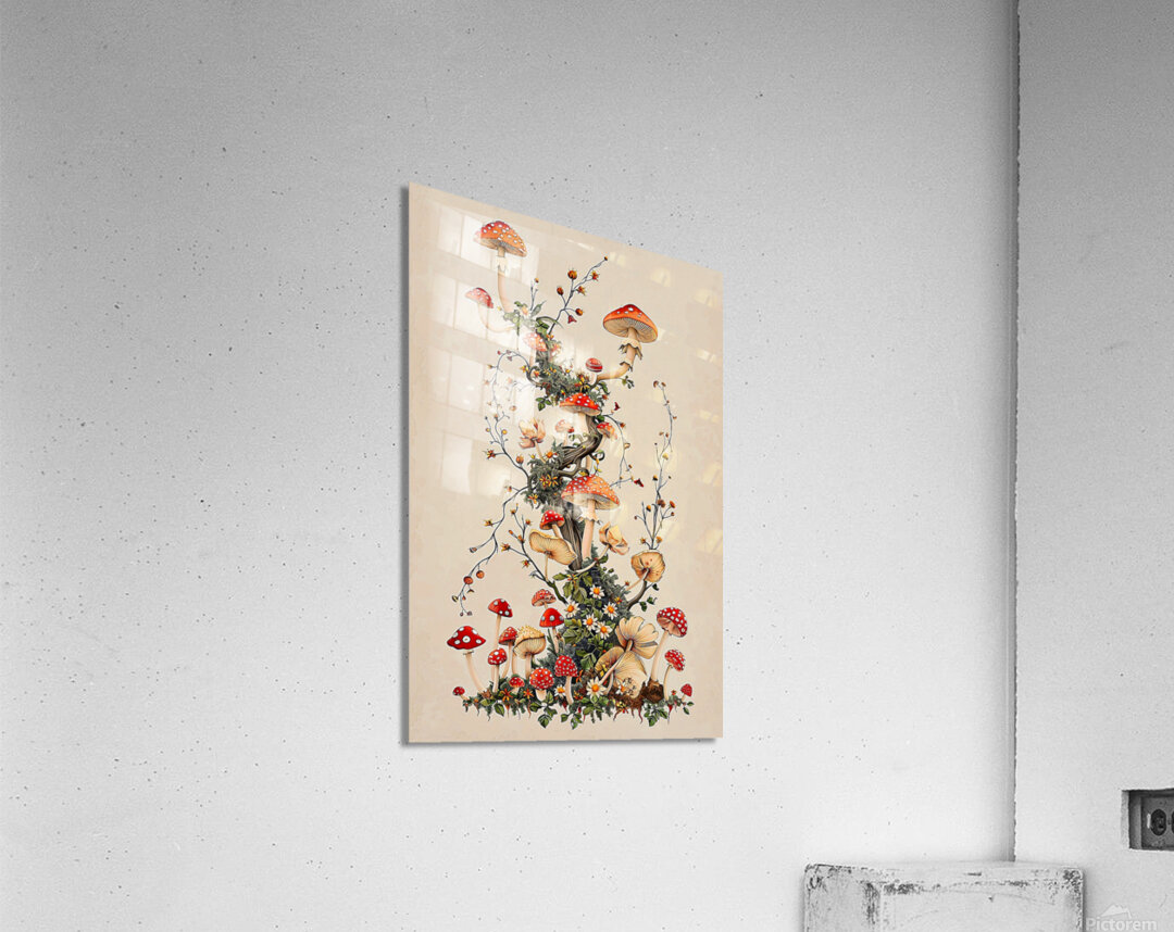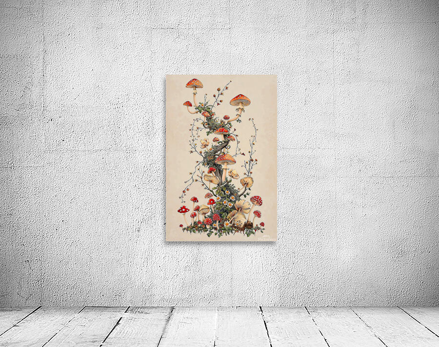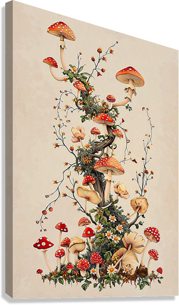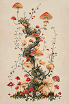 This captivating image presents a whimsical arrangement of red-capped mushrooms, gracefully intertwined with delicate vines and blooming flowers. The mushrooms, rendered in a charming, illustrative style, feature classic red caps with white spots, creating a sense of nostalgic fairytale charm. The composition spirals upward, drawing the eye along a natural, organic flow, while the soft, muted color palette lends a sophisticated and calming ambiance. The image is ideal for home decor and wall paintings, bringing a touch of nature-inspired whimsy and a subtle pop of color to any space. Its versatile aesthetic complements various interior styles, from bohemian and eclectic to cottagecore and modern rustic. The intricate details and gentle tones make it a focal point that adds character and a sense of enchantment to living rooms, bedrooms, nurseries, or any area in need of a unique and visually appealing accent.
