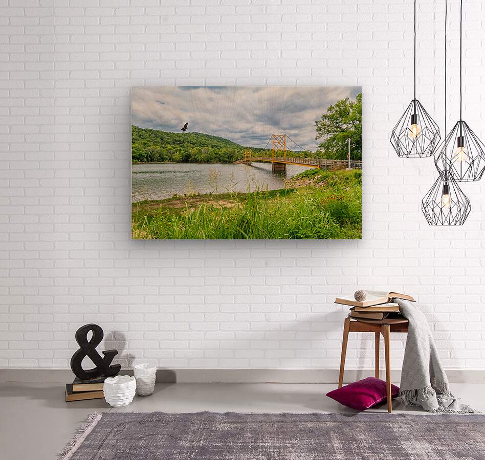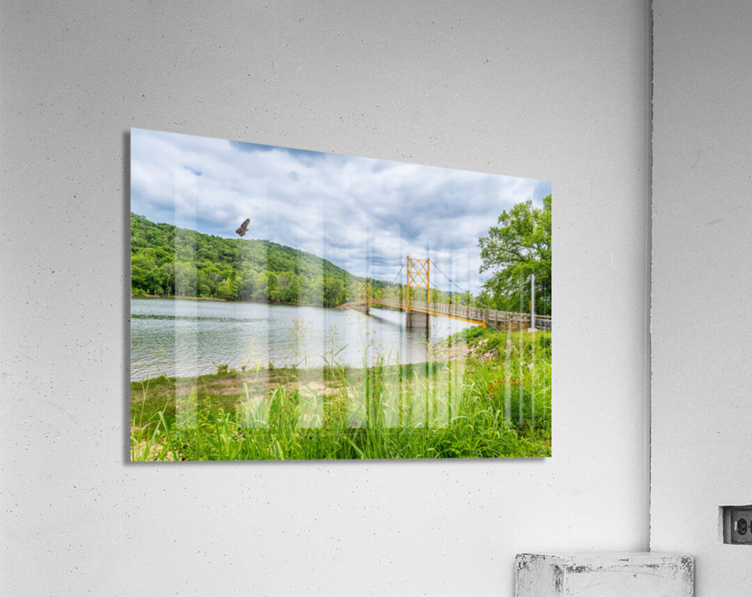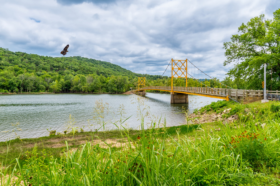 A hawk fly's over a yellow suspension bridge nicknamed Little Golden Gate as clouds fill the sky. This is Beaver Bridge. It crosses over the White River at Table Rock Lake. Located in Beaver, Arkansas, United States, and part of the Ozarks, it was built in 1949. In 1990 it was added the National Register of Historic Places as it's the only suspension bridge still open in the state of Arkansas. I was standing behind some tall grass beside the bridge. You can feel the bridge move as you drive across it. It is cool and a little scary at the same time. This photo was taken by Jennifer White with Timeless Moments Photography. All images are copyrighted © Timeless Moments Photography/Jennifer White. All rights reserved. Please note the watermark does not print on ordered products.