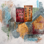 Geometric shapes in earthy tones overlap, creating an abstract cityscape. Buildings with window-like patterns are set against a textured backdrop, blending blue and green hues.