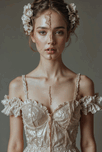 In a serene moment a young woman stands poised amid a soft muted backdrop. The light gently cascades over her casting a delicate glow that highlights her features with an ethereal quality. She is adorned in a gown of intricate lace its fabric whispering elegance as the soft ruffles at the shoulders seem to bloom like petals around her. This dress with all its romantic detail speaks of a bygone era a time when grace was woven into every aspect of life. Her hair gently adorned with small flowers hints at a connection to nature a reminder of sunlit meadows and the fragrance of blossoms in spring. The tendrils of hair that cascade down her forehead evoke a sense of vulnerability as if she carries secrets only the earth knows. Her expression is thoughtful and introspective drawing the observer into a world where emotions run deep and stories await unraveling. Each element in the image—the soft fabric the gentle flowers the contemplative gaze—carries its own story. Together they weave a narrative of beauty transience and perhaps a longing for connection both to oneself and to a world outside. This visual composition invites moments of reflection urging one to consider the layers of life hidden beneath the surface much like the layers of fabric that envelop her. In this quiet tableau a timeless dance of elegance and emotion unfolds leaving a lingering sense of wonder.