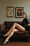 A woman in a black shirt and high heels sits on a brown leather couch her legs crossed. The couch is positioned in front of a wall with two framed pictures. The picture on the left features a woman with her face obscured by a veil of hair while the picture on the right depicts a man in a pilot uniform. The woman on the couch looks directly at the camera her expression thoughtful and slightly distant. The overall tone of the image is sensual and alluring with the womans elegant posture and confident gaze drawing the viewers attention. The muted colors and soft lighting create a sense of intimacy and mystery.