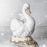 A delicate sculptured swan stands elegantly surrounded by falling snowflakes in lakes of porcelain winters
