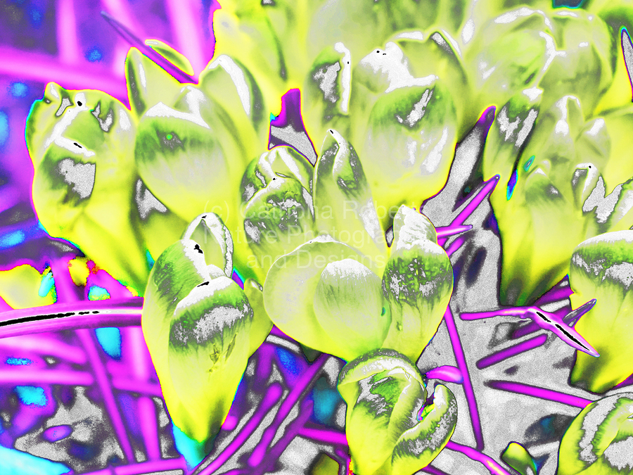 A coloured photo featuring Crocus flowers laterally digitally manipulated into a stunning piece of floral abstract art. Features bright green flowers ...[+]
