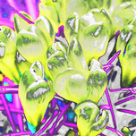 A coloured photo featuring Crocus flowers laterally digitally manipulated into a stunning piece of floral abstract art. Features bright green flowers with abstract details create a vivid and surreal appearance. The background contrasts sharply with shades of pink and blue, enhancing the vibrant composition.