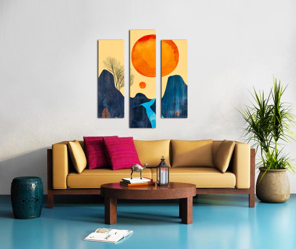 A vibrant composition features a large glowing orange sun above a stylized landscape with blue hills and a winding river. Sparse trees with fine branc...[+]