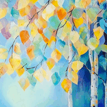 Colorful autumn leaves hang delicately on thin branches displaying a spectrum of yellows oranges and blues. The subtle blend of colors creates a seren...[+]