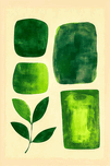 Four abstract green shapes are arranged on a soft yellow background along with a simple depiction of a leafy branch. The minimalist design uses different shades of green to create a harmonious and modern feel.