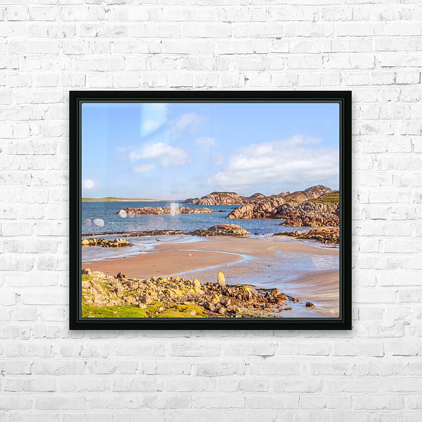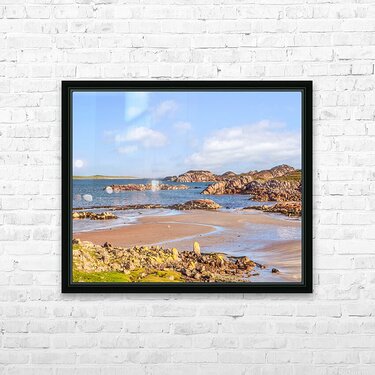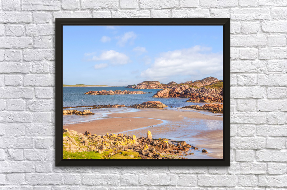 The beach at Fionnphort Mull Scotland with Iona in the background. Fionnphort is the ferry terminal for Iona. Wall Decor Frame