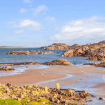 The beach at Fionnphort Mull Scotland with Iona in the background. Fionnphort is the ferry terminal for Iona.
