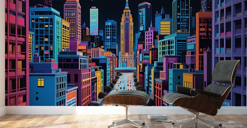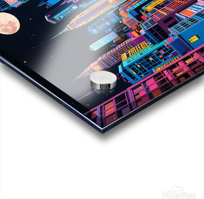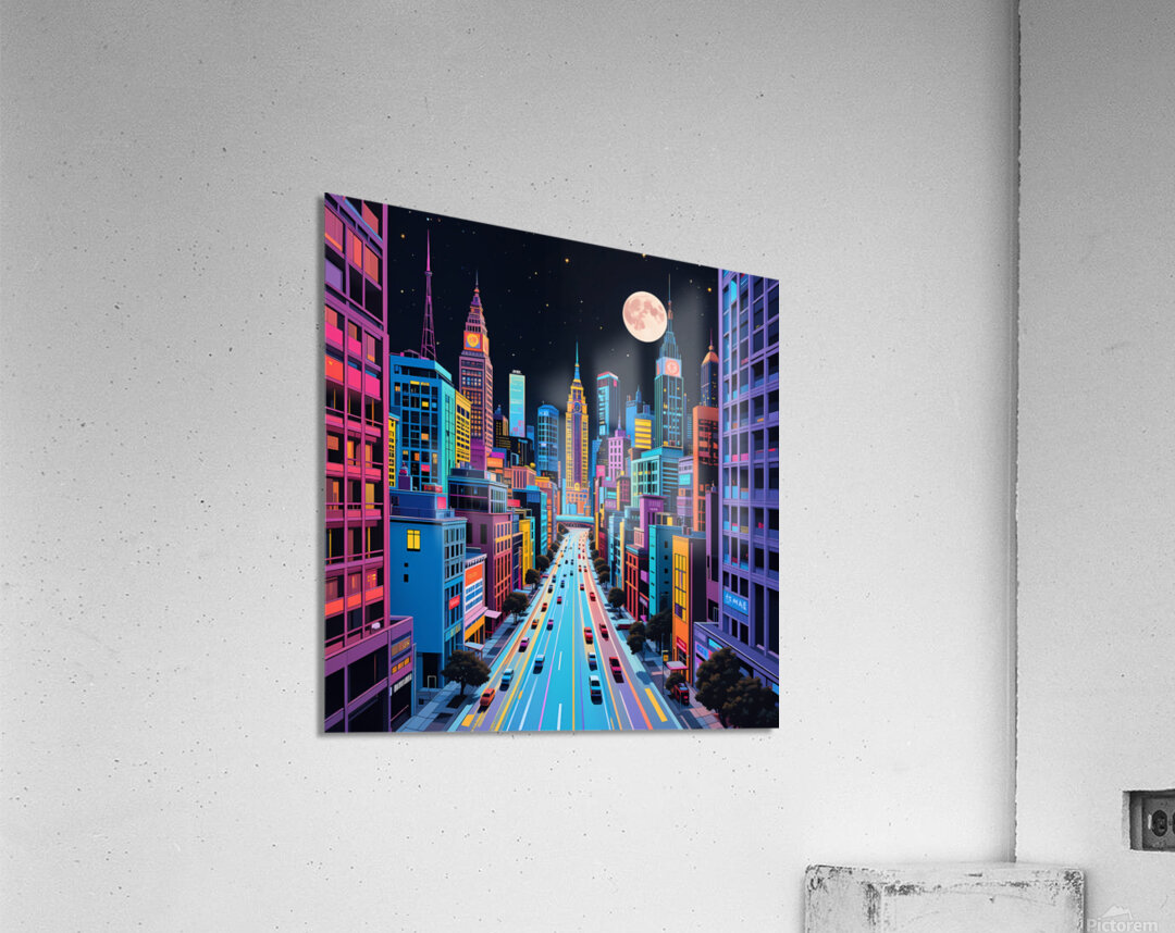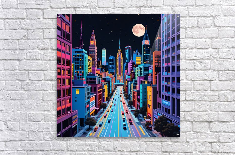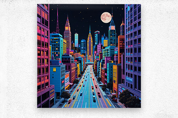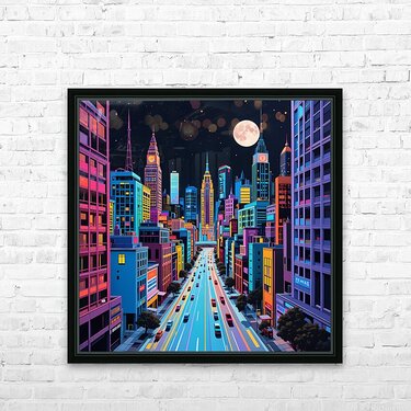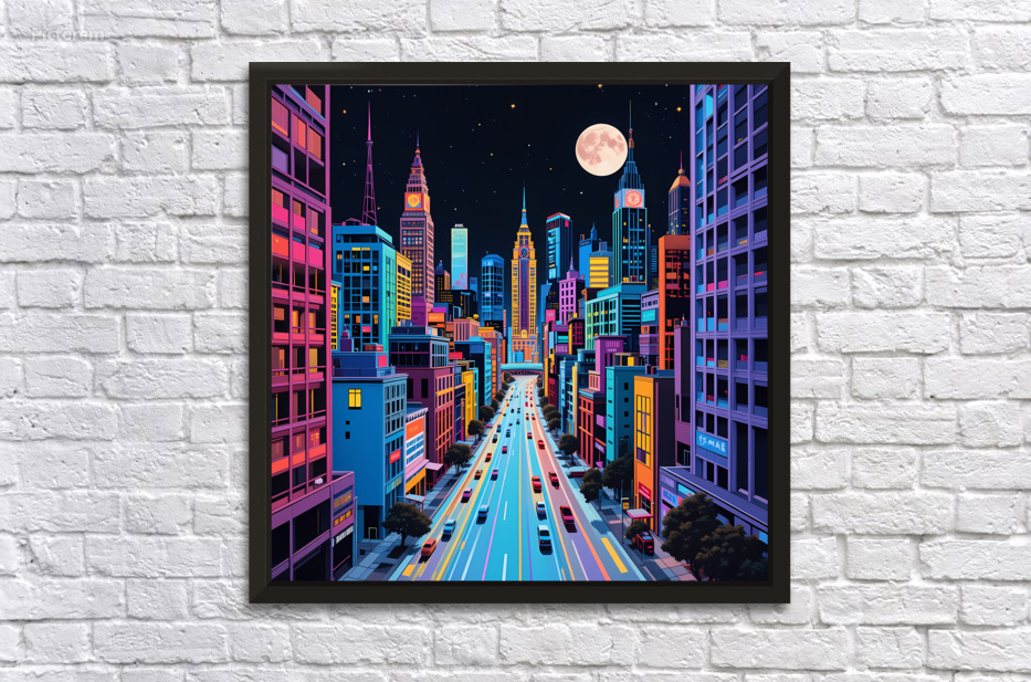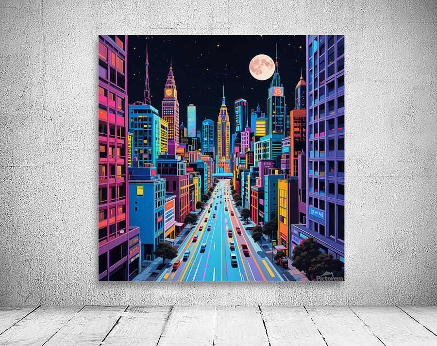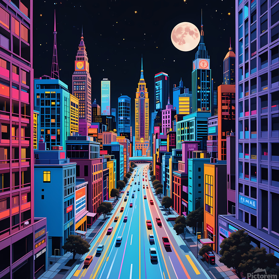 Illuminate your space with this dynamic nighttime city view poster, featuring a bustling urban scene under a glowing moon. The vibrant neon colors and...[+]